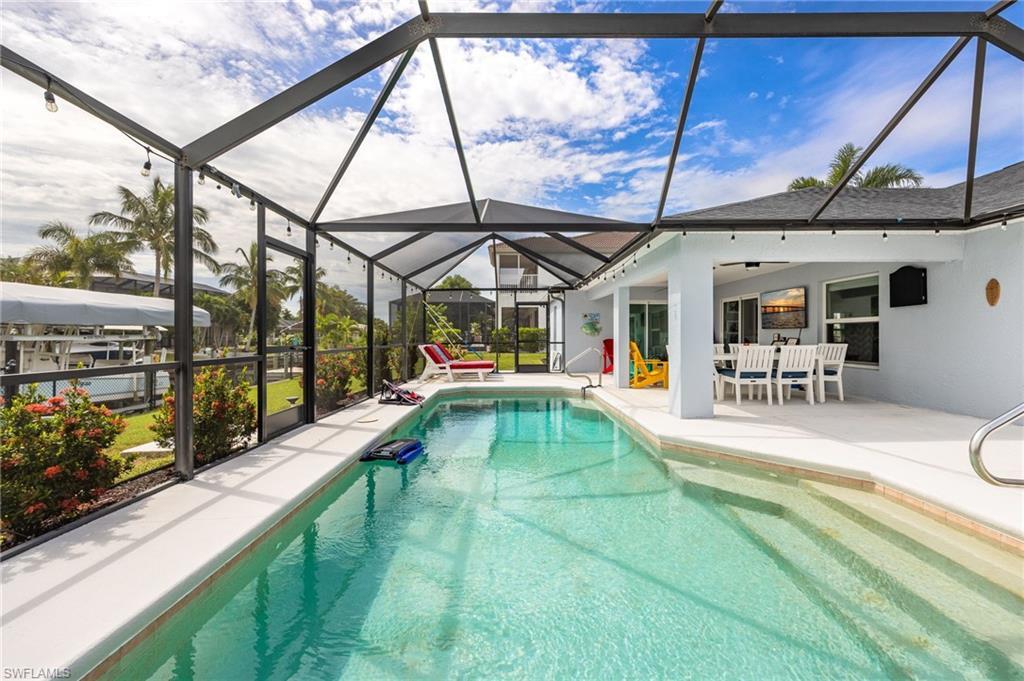 This impressive, move-in ready Gulf-access home is tucked within the highly sought-after Four Mile Cove neighborhood, surrounded by immaculately maintained luxury residences. With quick access to the Gulf, it offers the perfect combination of modern comfort, timeless style, and Florida waterfront living. Inside, soaring ceilings in the kitchen and living room create a light-filled, open atmosphere that feels both spacious and inviting. The home has been beautifully renovated with wood-plank tile flooring throughout, a chef-inspired kitchen featuring new white cabinetry, quartz counters, a large island, and ample pantry storage. Offering four bedrooms, the layout is ideal for families and guests. The primary suite includes a soaking tub and separate shower, creating a private retreat. The upgrades add incredible peace of mind: a brand-new roof (September 2022), brand-new impact-resistant windows (January 2024), a new pool heater, and a 3.5-ton AC with Nest technology. Outside, enjoy a private dock with a boat lift equipped with a GEM remote, a dock cover, and a concrete dock with water and electric. The fully fenced yard is lushly landscaped with 50’ palms, creating a true tropical oasis. All of this in a prime location within walking distance to Starbucks, ALDI, Chipotle, Esporta, HomeGoods, Publix, and more. With no hurricane damage and every upgrade already completed, this home is the perfect place to experience the Cape Coral lifestyle.