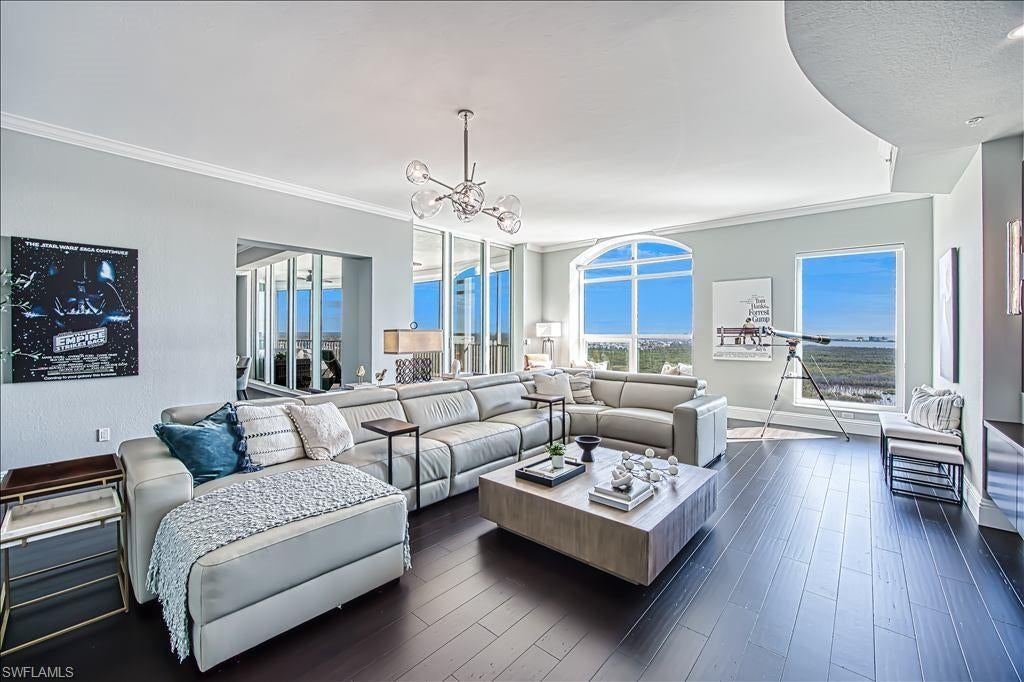 This RARELY avail 4,300+ sq ft, 20th fl PH is as STUNNING inside as the view is outside. The interior has been completely renovated & updated w/high end finishes (a complete list is attached to the listing) while the exterior vistas offer panoramic views equal in the WOW factor! The moment the secured elevator opens into a private foyer & you continue through the tall, double doors, your eyes are drawn out to the Gulf & Bay. The waters shimmer from the sunlight by day & moon beams by night. Catch The Key West Express, FMB Pirate’s ship, shrimping & fishermen’s boats heading out every morning and returning each evening. Floor to ceiling sliding glass doors & tall, arched windows frame the mesmerizing horizon from almost every room. The N end of FMB & E end of Sanibel, including the historic lighthouse, are bookends flanking the endless view. Two generous, tiled, screened lanais - #1 is 10’ x 20’ and accessed exclusively from the primary retreat while #2 is 34’ X 15’ and accessed by the living, dining & family rms - offer outdoor living & entertaining space. The sliders & windows are hurricane impact & both lanais are out-fitted with Storm Smart shades. 10’ ceilings offer additional volume & light. The main living area, currently used as a media room, has a custom, built-in, floating entertainment console. This area flows into a formal dining rm where you can enjoy family gatherings while witnessing colorful sunsets. Adjacent is a Butler’s Pantry w/wet-bar & wine refrigerator. A chef’s kitchen, featuring a sizable island & countertops w/quartz & SS appliances, is open to the family room allowing the family chef to interact w/guests while prepping meals. A den/office, located just off the family room, could easily be turned into a 4th bedroom. The ½ BA w/pedestal sink & 2 in-suite guest bedrooms & ample laundry w/deep sink & storage complete this end of the condo-home. For privacy, the primary suite is located on the opposite end from the guest bedrooms and has a private lanai, 3 sizable walk-in closets w/California Closet organizers. The in-suite primary BA features dual sinks & separate vanity w/quartz, private water closet, large walk-in shower & free-standing tub. A generous 19’W X 35’D private, under-bldg garage conveys. A detached 1-car garage is available for an extra cost. All of this is situated on 50+ acres providing privacy due to the low-density. Enjoy a 25-acre crystal clear lake, lush, tropical vegetation & resort style amenities including a 6000+ sq ft completely renovated clubhouse w/fitness center, yoga studio, billiard rm, gathering space, dining area, kitchen & media center. The grounds feature tennis/Pickleball courts, bocci, dog park & 1-mile long shell path surrounding the lake. The property backs up to 700+ acres of preservation land & offers a prime location for walking to a beach, restaurants, shops, grocery & close enough to a bike to Sanibel & FMB.