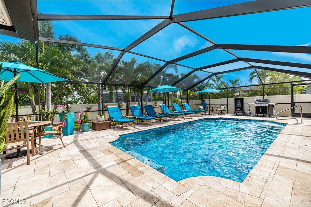 Showcasing features rarely found at this price point, this turnkey furnished salt-water pool home is packed with extras. Step into a 60-foot-wide lanai designed for memorable days and relaxing evenings. The heated salt-water pool (installed 2016) anchors shaded and open-air areas with multiple lounging spots and dusk-to-dawn landscape lighting for an inviting evening glow. All-Panama Jack furnishings—two living sets both with fire tables, a half dozen loungers, two dining tables with umbrellas—plus a Weber grill, Masterbilt smoker, and large TV make the outdoor retreat stand apart. The privacy-fenced yard is richly landscaped and offers protected space for children or four-legged friends. Peace of mind comes with a durable metal roof, hurricane-impact windows and sliders (2021), a 9.5 kW dual-fuel generator, and an assumable flood-insurance policy. Built in 1997 and located across from Gulf-access homes/near top-rated schools, this residence blends everyday comfort with an outdoor lifestyle seldom found in this price range. Inside, nearly 1,700 square feet provides 3 bedrooms and 2 baths with tile flooring throughout, granite counters, attractive cabinetry, and stainless appliances including an induction cooktop. Furnishings and accessories—valued well over $40,000, everything down to bikes to beach chairs—are all included, making this an ideal vacation rental, seasonal getaway, or ready-to-go full-time residence.
