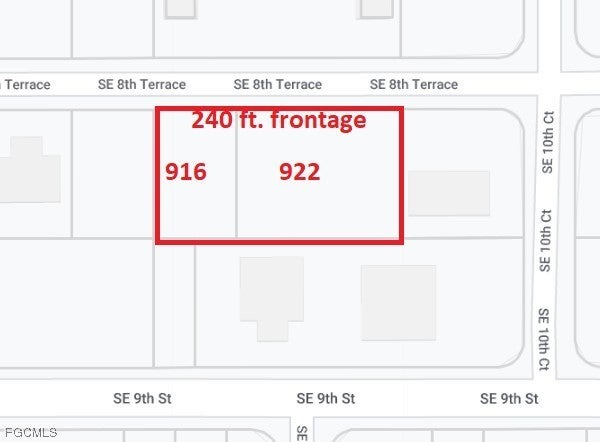 This sale includes property address #916 (appox. quarter acre) and #922 (approx. half acre) SE 8th Terrace. A rare opportunity to own +/- 240 feet of road frontage, zoned Professional (P) with future land use Commercial Professional (CP). All city utility assessments paid in full. This is 2 parcels being sold together for a total of 6 lots. On the outer edge of Cape Coral Industrial Park with great access to Del Prado Blvd. This zoning allows for multiple uses. Multi Family buildings on North side of same street--maybe rezoning to multi family is possible? Tax amount shown is total amount paid for both parcels.