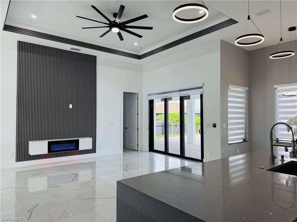 Welcome to this new, luxurious ready to move in POOL home in the sunny cape coral. Recently upgraded amenities make this home the perfect place to live. Modern concept with a transitional aspect. This is an open floor plan offering large spaces, with a formal dining room, quartz countertops in kitchen and bathrooms, beautiful backsplash, energy efficient stainless-steel appliances, kitchen exhaust fan, porcelain tile throughout, lighting is spectacular in this property w/custom lamps & boasting with natural light. All impact windows featuring zebra shades, custom cabinetry in master walking closets & guests. Entertainment expands in the outdoors offering a pool, large, fenced yard and outdoor kitchen. Amazing three car garage one-of-a-kind home!!! Just 10 minutes from PINE ISLAND CORRIDOR 15 minutes to Burnt Store Marina with dining, boat rentals, and storage. The highly anticipated 7 Islands Project—bringing shopping, marinas, a tiki bar, waterfront restaurants, and a Marriott—will soon transform NW Cape! A great opportunity for both families and investors.
