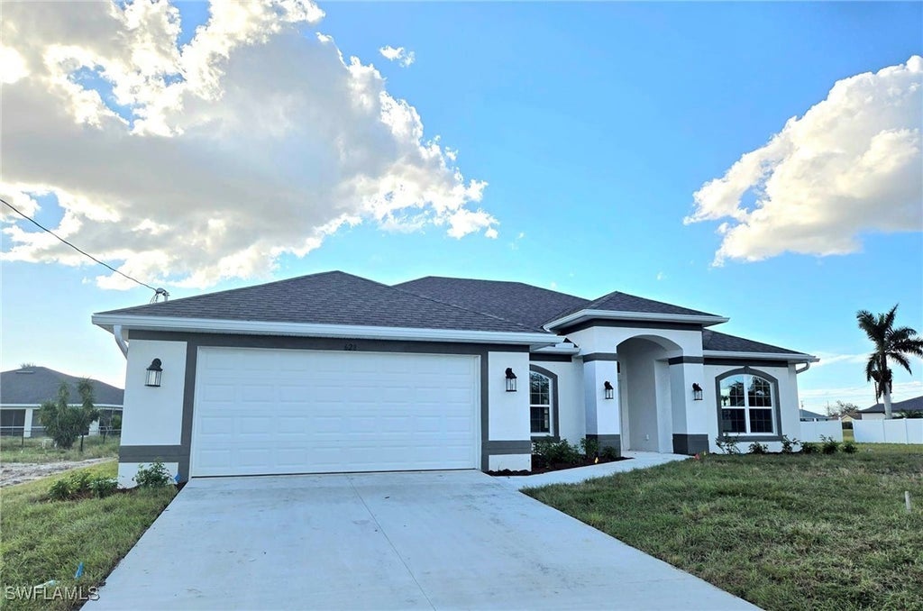 New Construction in Desirable NW Cape Coral! (NO FLOOD INSURANCE NEEDED) 2330 Sq Ft Single-Family Home This stunning new construction home is coming soon to the coveted Northwest Cape Coral! Featuring an open floor plan, this spacious 2330 square foot residence offers a perfect blend of style and comfort. Open Concept Living: Enjoy the flow between the living, dining, and kitchen areas, perfect for entertaining. Elegant Details: French doors in the living room, elevated ceilings, and a den/office provide a touch of sophistication. Gourmet Kitchen: Stainless steel appliances, upgraded cabinetry, and granite countertops create a chef's dream kitchen. Master Retreat: Relax in the master suite complete with a dual vanity and a luxurious 5' tiled shower. Outdoor Oasis: A beautifully landscaped yard with a convenient digital sprinkler system awaits. Don't miss this opportunity to own a brand-new home in one of Cape Coral's most sought-after neighborhoods! EXCELLENT 1/2/10 YEAR WARRANTY INCLUDED.