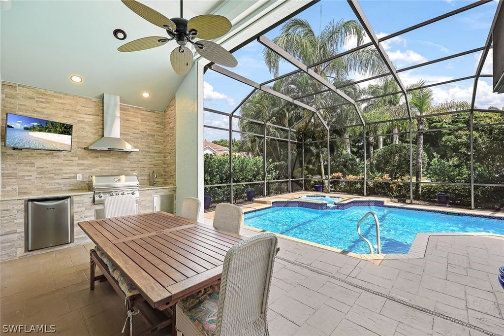 Indulge in the Pelican Marsh lifestyle within this amenity-rich, gated community in North Naples. This very special home in a unique location can now be yours. Relish the sun-filled home at the end of the street, nestled in a quiet location, surrounded by lush tropical landscaping that provides open views and exceptional privacy. The lanai is perfect for outdoor entertaining and features a like-new outdoor kitchen 2019 with a gas grill, mounted TV adjacent to the refurbished pool and spa. For your convenience and peace of mind, the home is equipped with electric hurricane shutters, select impact windows, and a new AC and water heater installed in 2024. NEW ROOF as of 9/2024! This spacious single-family home offers three bedrooms and three full baths, with two bedrooms conveniently located on the main level. The second floor includes a third bedroom, a full bath, and a versatile loft that can serve as a fourth sleeping area or an office space. The owner’s suite boasts a remodeled bathroom with a walk-in frameless shower, dual-sink vanity, a large walk-in closet, and direct access to the lanai. The great room design creates a sense of openness with volume ceilings and a seamless flow into the dining area and updated kitchen. The kitchen is a chef’s dream, complete with stainless steel appliances, custom cabinetry, soft-close drawers, and a wine cooler. Situated in a unique location in Ventura, this home is minutes from world-class shopping, dining, and pristine beaches. The community offers an array of amenities, including a top-notch tennis program with an on-site pro, a fitness center with a trainer and active classes, bocce, pickleball, and the newly added Courtside on-site restaurant. Pets welcomed with a limit of 2. This neighborhood is enhanced by mature tree-lined streets, safe sidewalks, and roving security. Private golf memberships are available separately for those seeking an exclusive golf experience. Don’t miss this opportunity to enjoy the best of the Pelican Marsh lifestyle!