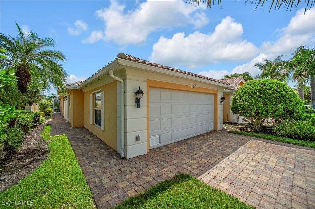 An excellent example of an impeccably clean Capri villa, a 2 bed + open den/2 bath house. This home has an extra large extended screened lanai with a southern water view. Electric and cable are already in place in the screened lanai. Extended tile throughout the home, no carpet anywhere. The garage has been painted and a brand new epoxy floor installed. Brand new AC was just installed as well as fans throughout the house. Both bedrooms are extra large making this a comfortable space for you and your guests! The white and bright kitchen has a large wrap around breakfast bar and plenty of storage. In home laundry complete with natural light, extra storage, sink, and counter space. All closets throughout are finished. Plenty of windows allow for natural light to flow throughout. Verona Walk offers 24 hr. guarded gated entry, lighted tennis, bocce ball, basketball and pickle ball courts, resort-size community Lagoon pool, lap pool, tot lot, over 20 miles trails, 24/7 gym, post office, café/restaurant, ice cream Shoppe, hair salon, car wash, gas station, library, computer center, ballroom, card rooms, and a full-time activities director. Convenient to both Naples and Marco Island beaches, shops and fine dining, regional hospital and Edison college nearby. The low HOA dues also include lawn care & irrigation, basic cable TV.
