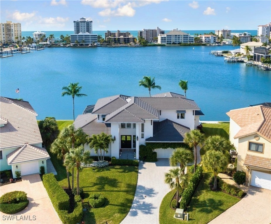 $1 million price improvement! Welcome to the captivating 414 Palm Ct, a jewel nestled in the heart of Naples, Florida. This stunning property, a winner of the prestigious Sand Dollar award, is a testament to refined living, where every detail is meticulously crafted. This award-winning residence is situated on one of the best lots in all of North Naples, with 173 feet of frontage and long wide bay views. Offering four spacious bedrooms, each accompanied by its own bathroom, this property is a beacon of comfort and luxury. An additional den provides that extra space for your hobbies or home office. Every day here ends with a spectacular sunset, painting the sky with hues of orange and pink. Water lovers, imagine fishing right off the back of your home or enjoy paddle boarding or kayaking amongst the local dolphins. With direct waterfront access and a private boat dock, your nautical adventures are just steps away. And when you're done sailing, take a dip in the pool or unwind in the hot tub as you watch the sunset. The open floor plan offers a seamless flow from the indoors to the outdoors. The large lanai, complete with an outdoor kitchen, is the perfect spot for alfresco dining or lounging under the Florida sun. Two primary suites provide an extra touch of luxury, offering a private retreat within the home. Each suite is a sanctuary of comfort and style, with ample space, natural light, and breathtaking bay views. Another huge advantage to this home compared to others is that it is located on a street with just 7 homes, and it is the closest street to the beach! Walk to the Ritz-Carlton for drinks or dinner on the beach as well as Turtle Club and Baleen, some of the only Gulf front dining in all of Naples. The super popular Mercato retail center is a 5 minute drive where you can find Whole Foods, a brand new Movie Theater, shopping and over 10 great restaurants. The owners currently enjoy a custom screened in cage, but it can easily be removed if the buyer desires. 414 Palm Ct is more than just a property; it's a lifestyle. A place where every day feels like a vacation, and every sunset brings a new spectacle to enjoy. This is your chance to experience the best that Naples has to offer, in a home that's as unique and captivating as the views it offers. ****This home was custom built at a higher elevation than required, no water intrusion during the last 3 hurricanes, even Gurricame Ian! Extremely rare for this area and very in demand!