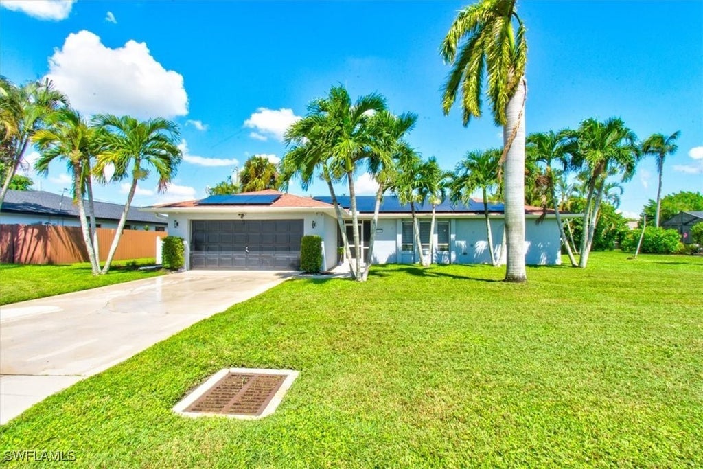 **SELLERS VA LOAN IS ASSUMABLE** Completely remodeled and better than new! This stunning Cape Coral home features high-quality finishes and thoughtful upgrades throughout. The sleek, modern kitchen is a chef’s dream with rich maple cabinets finished in a sable glaze, luxurious granite countertops, and convenient pull-out drawers. Both bathrooms have been beautifully updated with stylish tile work, offering a spa-like feel in every shower. The spacious laundry room includes a cabinet and utility sink for added functionality. Energy efficiency meets elegance—solar panels will be paid in full at closing, and the monthly electric bill is incredibly reasonable, typically ranging from just $25 to $75. Situated in the heart of Cape Coral, just off Santa Barbara Blvd and near Cape Coral Parkway, you'll love being minutes from Publix, shopping, dining, and all the local conveniences. This beautifully transformed gem offers modern luxury in a prime location—don’t miss your opportunity to own this Cape Coral treasure!