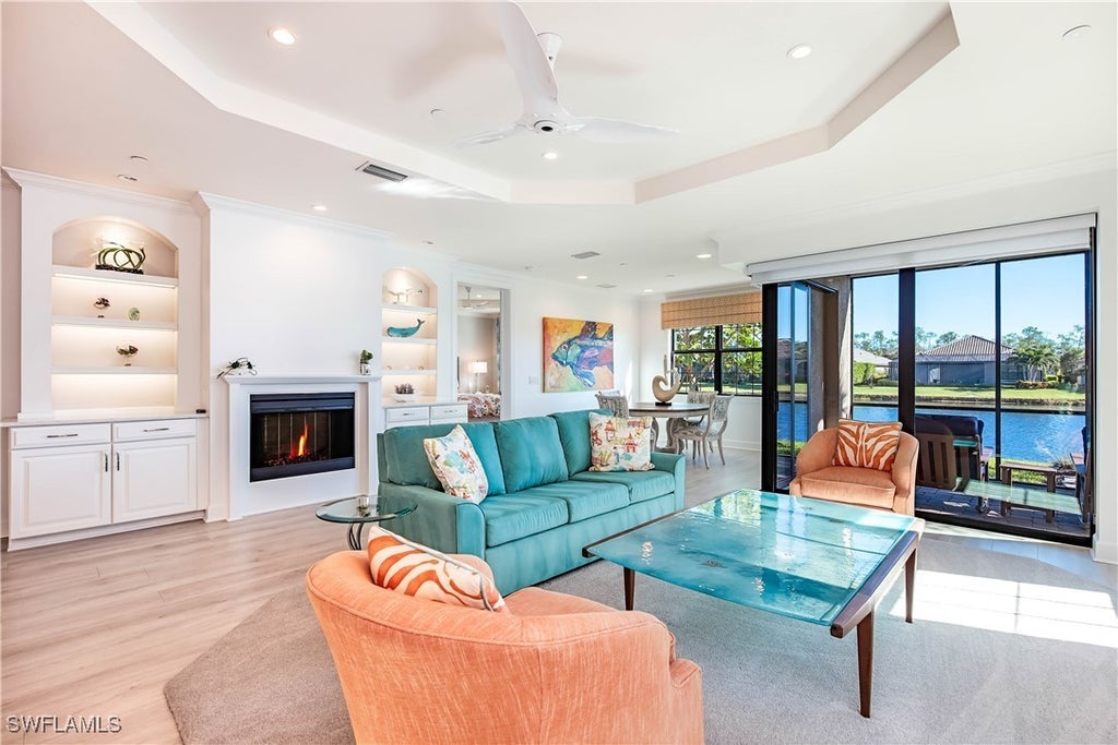 Discover unparalleled elegance in Naples’ premier golf gated community, Esplanade Golf and Country Club. This exquisite first-floor coach home features an open floor plan with 1,994 square feet of impeccable living space, ideal for entertaining family and friends. Enjoy serene lake views from the living, dining, and primary bedroom areas, or relax on the lanai overlooking the tranquil water. Boasting 2 bedrooms + a versatile den, and 2.5 baths, this residence offers an abundance of natural light, creating a warm and inviting retreat. The large kitchen includes a breakfast bar and state-of-the-art appliances, perfect for casual meals or culinary endeavors. The expansive primary suite provides a private sanctuary with a walk-in closet, a luxurious shower with multiple showerheads, and dual sinks. Additional features include impact-resistant glass, an electric fireplace, a private one-car attached garage, and a charming front patio off the guest en-suite. Living in this exclusive home comes with access to the Esplanade’s world-class amenities, including an 18-hole private golf course, a resort-style pool, a state-of-the-art fitness center, private walking and biking trails, and a dedicated dog park. Recreation opportunities abound, with tennis, pickleball, and bocce courts, while the vibrant on-site coffee café and full-service restaurant and bar elevate every moment. Residents can unwind by the sparkling pool with private cabanas, complete with service from the poolside Bahama bar, or pamper themselves at the luxurious day spa. This home also includes the perks of a coveted social and sports membership, offering a seamless blend of luxury, comfort, and natural beauty. Don’t miss the chance to call this exceptional residence your home.