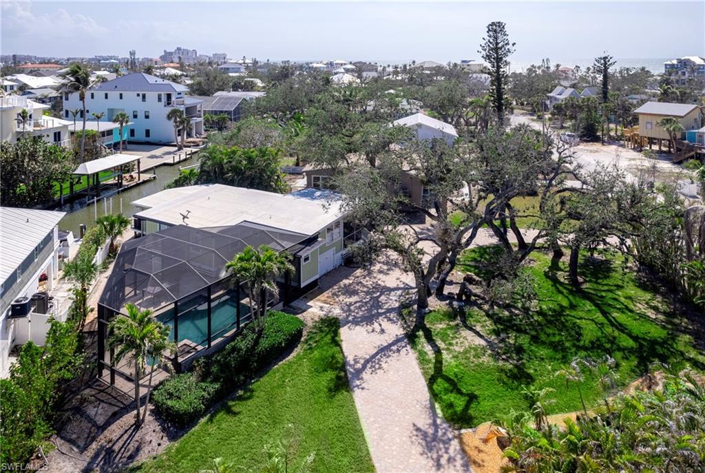 Nearly 1/3 acre property. Waterfront and Public Beach Access #15. If you love taking the sea dos out to the bay and if you love hanging out on the beach this home is for you. It's also nestled in a park like setting under trees and a natural, navigable canal to Estero Bay Aquatic Preserve. Trees and gardens adorn the front yard with a paver lined circle driveway on two frontages. Saltwater pool covered with an oversized pool cage with pool bath and outdoor shower. As you enter through the front door you step in to a recently remodeled home with high end features and view of the canal through the open concept living area and kitchen. Natural light soars throughout the home. Coffee bar and wine cooler with lighted glass cabinets and two bedrooms and a bath are at the living area level. Up a few steps is the primary ensuite bedroom. A few steps down and you are at the brand new kitchen with quartz counters and new cabinets and stainless steel appliances. Plenty of storage and built ins in this waterfront gourmet kitchen. From the kitchen, sliding glass doors lead to the updated waterfront patio with cable railing. The home has been totally remodeled and inspected from the studs inward. Impact windows and doors, hvac, plumbing and electric all renovated in 2023. Laundry area is at kitchen level with exterior entrance. Cable railing installed around back patio and laundry room stairs and landing area. Beach access #15 at Sterling and Estero Blvd.