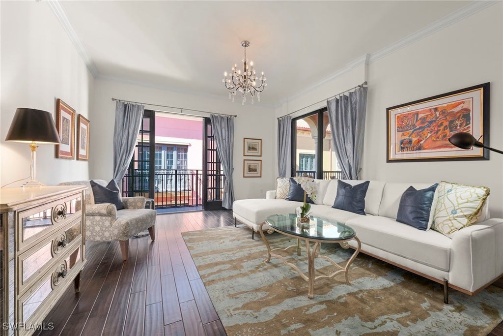 Walk to shops and restaurants! Upon entering this private retreat, you will be delighted by the light bright interior and upgraded finishes. The den area is a cheery dining place adjacent to the chef’s kitchen, with high-end stainless steel appliances including an induction cooktop and convection oven, Bosch dishwasher, Miele steam oven and a built-in coffee machine. Custom cabinetry and quartz countertops offer an additional area to prep as well as display your cherished collections. Hardwood floors are warm and inviting. The primary suite is separated from the guest bedroom for optimal privacy and opens to the spacious lanai overlooking a private courtyard. The primary en suite offers a respite from a long day of shopping! Upgraded lighting highlights the elegant space and volume ceilings giving an air of openness and spaciousness. Impact glass windows and doors provide security and peace of mind. This gorgeous residence is offered furnished with luxurious furnishings, lights and artwork. Enjoy the convenience of a reserved parking spot in the gated garage. The Residences offer a resort-style swimming pool and spa, fitness facility, grilling area and a clubhouse ideal for getting to know your neighbors and living your best active lifestyle, all within walking distance to high-end shopping and restaurants at Coconut Point, where discounts are offered to residents!.