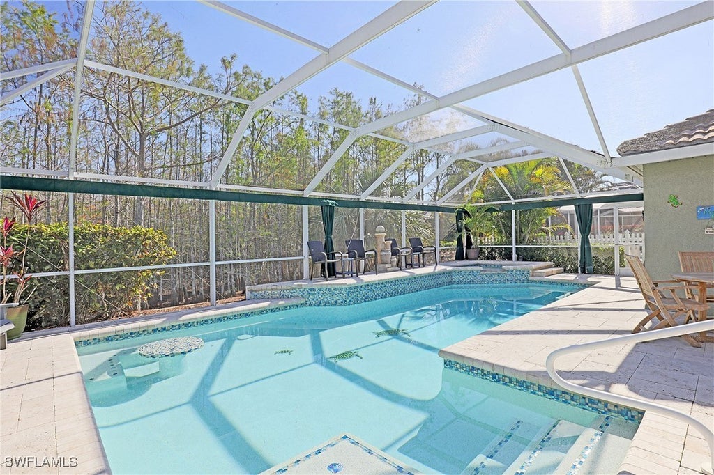 Seasonal lease now available in North Naples Gated Community of Sterling Oaks. House with 3 Bedroom plus Den, 3 full baths, includes large pool and hot tub with screened cage. House was fully renovated 4 years ago and includes a large great room with high cathedral ceilings. House has King, Queen, and 2 twin beds. Den has a Queen memory foam sleep sofa and can be used as a 4th bedroom. All bedrooms, den, living room and outside dining area have TV's (6 total). Kitchen includes large island that also seats 6 and raised kitchen table sits 8. Kitchen includes all new Stainless French Door Fridge, Stove/Oven, Dishwasher, and Microwave. Extra Large Washer and Dryer includes steam. Sterling Oaks is a gated community and includes a club house with large pool, hot tub, outdoor bar/lunch, pickle ball, club house with sauna, gym, showers, meeting rooms, dining room and bar. Tennis club is also available. Short distance to beach, Mercado Mall, Coconut Point Mall. Electric will be charged as an additional fee.