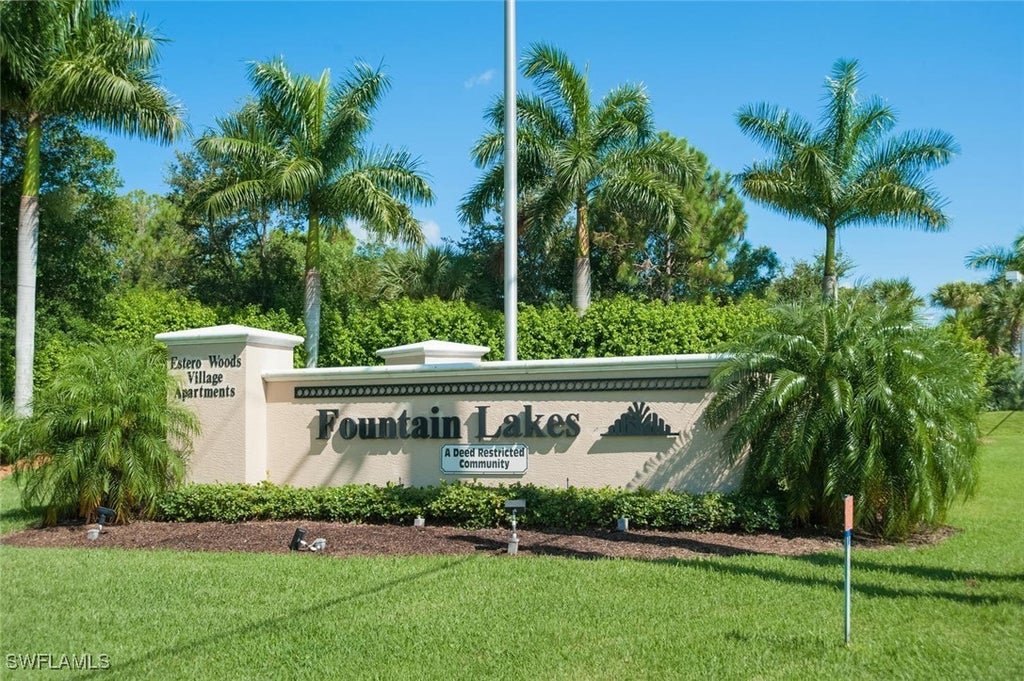 Available for off-season rental, this charming 2-bedroom, 2-bathroom attached villa is located in the desirable, gated community of Fountain Lakes—just minutes from Coconut Point Mall and the beautiful Gulf beaches. Nestled on a quiet cul-de-sac, the home offers a peaceful retreat while still being conveniently close to shopping, dining, entertainment, and the airport. Inside, the open-concept floor plan features a split-bedroom layout, providing both privacy and comfort. The kitchen includes a cozy breakfast area and solid surface countertops, while the spacious dining and great room combination is ideal for relaxing or entertaining. Plantation shutters throughout add a touch of style and elegance. The backyard overlooks lush landscaping and the community’s private 9-hole, par-3 golf course, which residents may enjoy at no extra charge. Please note: pets are not allowed, per HOA regulations. This villa is the perfect getaway for anyone looking for a relaxing and convenient off-season vacation spot.