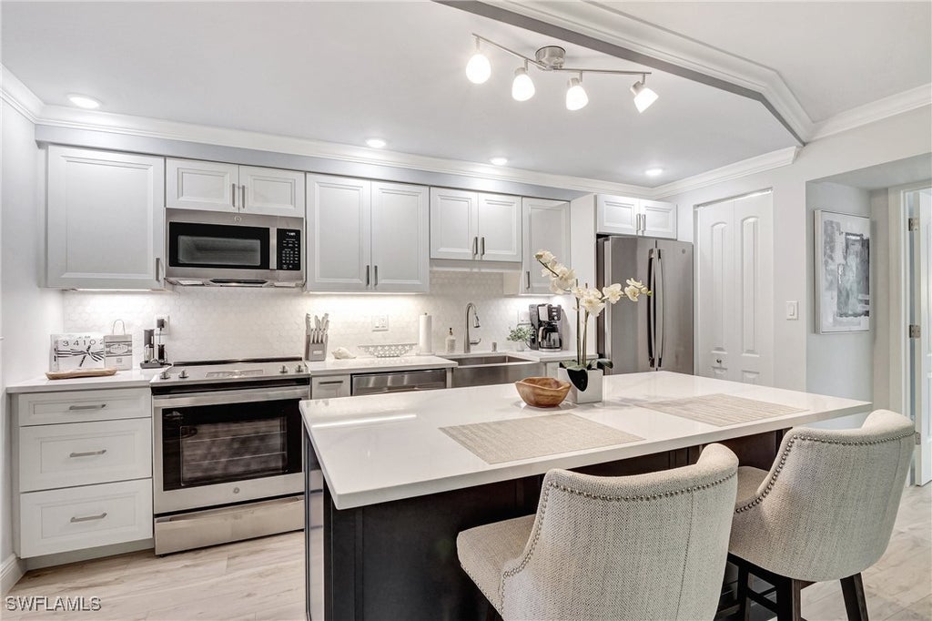 How does this sound: Priced to Sell! Prime location in Olde Naples—this beautifully updated turn-key 1BR/1BA first-floor end unit condo is a rare opportunity at just $325,000. Light, bright, and fully turnkey, this spacious residence features a modern white kitchen with stainless-steel appliances, marble backsplash, and a large island. The open-concept great room is ideal for relaxing or entertaining. Oversized bedroom with double closet, fully updated bath, and in-residence laundry add comfort and convenience. New windows and doors throughout. New AC, hot water heater, and stainless appliances. Enjoy a peaceful courtyard setting with lush landscaping, fountains, shared BBQ, and lounge areas. One pet allowed per unit. Extra exterior storage included. Proactive HOA with no current assessments and a flood mitigation plan underway. Located just blocks to 5th Ave, dining, shopping, Cambier Park, and the beach. Strong rental potential ($12K/month in season). Act fast—will be leased for the season if not sold within 30 days.