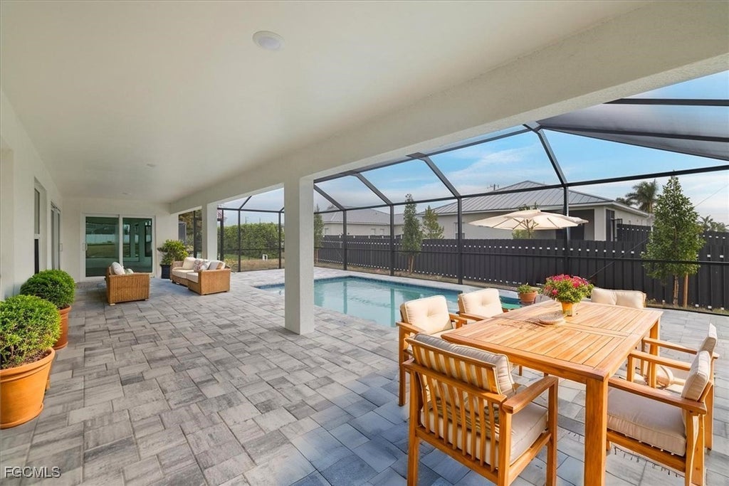THIS HOUSE IS HUGE! This Spacious Pool Home features 4 large bedrooms, 3 full baths, Two Primary Suites! Welcome to your dream home! Featuring two luxurious primary suites, this home offers the perfect blend of comfort and elegance. Step inside and experience the open-concept great room, highlighted by a 12-foot triple slider that seamlessly connects indoor living to the expansive 1,100 sq. ft. under-truss screened lanai and heated pool. The gourmet kitchen is a chef’s delight, boasting soft-close, all-wood cabinetry, quartz countertops, stainless steel appliances, and an oversized walk-in pantry for all your storage needs. The first primary suite is a true retreat—spacious enough for a king-size bed and additional seating, with direct access to the lanai and pool. Unwind in the spa-inspired ensuite, featuring a freestanding soaking tub and separate shower. Perfect for out-of-town guests or related living, the second primary suite has a full bath that doubles as the pool bath and walk in closet. Built by a trusted local builder, this home offers incredible value in Cape Coral. Plus, enjoy peace of mind with a 10-year structural warranty, NO FLOOD ZONE + IMPACT WINDOWS = LOW INSURANCE COSTS. FENCE OPTIONS AVAILABLE, ask for details. Don’t miss out on this opportunity to live the Florida lifestyle at its finest. This is The Paradise Cove Plan