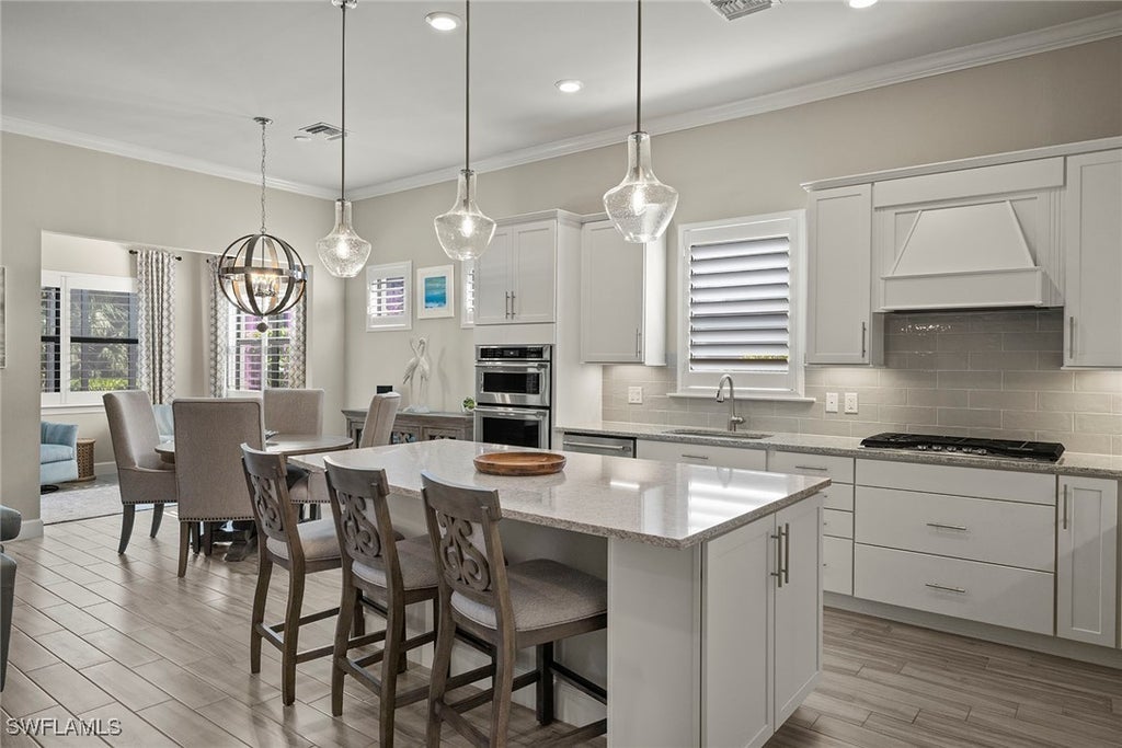 In the prestigious Greyhawk at Golf Club of the Everglades, this furnished modern pool/spa home, built in 2018, offers a refined blend of luxury and tranquility. Boasting private garden views, this meticulously maintained three-bedroom, two-bath residence provides a serene retreat while being just moments from world-class amenities. Step inside to wood-pattern tile flooring, crown molding and tray ceilings, all complemented by white baseboards and plantation shutters for a timeless aesthetic. The foyer welcomes you with a statement chandelier, while a custom mudroom with a built-in bench, storage cubbies and coat hangers offers convenience and style. The open kitchen is a chef’s dream, featuring white shaker-style cabinetry, quartz countertops, a designer tile backsplash, recessed lighting, and a large island with a breakfast bar and pendant lighting. A window above the sink adds natural light, while top-tier stainless steel KitchenAid appliances, including a five-burner gas cooktop, wall oven, microwave, refrigerator and freezer, and dishwasher, elevate functionality. The dining area seamlessly flows into the living room, creating an inviting space for entertaining. Expansive glass sliders open to the screened lanai, blending indoor and outdoor living. The spacious owner’s suite is a tranquil retreat, complete with an en-suite bath featuring a double-sink quartz vanity, a full-width mirror and a walk-in shower with a frameless glass enclosure. A large custom walk-in closet with built-ins and shelving offers ample storage. Two guest bedrooms are positioned near a stylish full bath, featuring a gray vanity with a quartz countertop and a shower-tub combination, ideal for family or visiting guests. The laundry room is designed for convenience, with a top-load washer, front-load dryer, overhead cabinets, a drying rack and a walk-in pantry with additional shelving. Step outside to a screened lanai with brick paver flooring, covered outdoor living space and a stunning pool and spa with a waterfall feature. Enjoy peaceful garden views, ideal for morning coffee or evening relaxation. Manually operated shutters provide added storm protection, while a whole-house generator offers peace of mind. Greyhawk at Golf Club of the Everglades offers a premier lifestyle with an 18-hole championship golf course, state-of-the-art sports complex, and two clubhouses with fine and casual dining. Residents enjoy a resort-style heated pool, lap pool, spa, outdoor tiki bar and cutting-edge fitness center. From May through October, members with a mandatory social golf membership enjoy access to the golf course and practice facilities, while a full golf membership remains optional. In a secure, gated enclave, this sought-after community offers the ideal balance of privacy and convenience, with world-class shopping, dining and entertainment just minutes away. Don’t miss the opportunity to make this exceptional home yours and schedule a private showing today!
