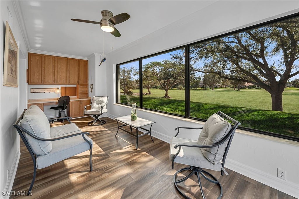 Looking for a charming, turnkey-furnished home with an enclosed lanai under air? This beautifully updated first-floor condominium, ideally located in Fairway Woods at The Forest, offers a rare bonus space, where large picture windows showcase tranquil garden views. Thoughtfully designed and recently furnished with new décor, this residence blends elegance and functionality with modern upgrades and timeless charm. Luxury vinyl tile and tile flooring complement white plantation shutters, crown molding and custom trim. The spacious kitchen features shaker-style cabinetry, quartz countertops, recessed lighting and an island with a window above the sink for natural light. Appliances, including a range, microwave, dishwasher, and French door refrigerator with an ice maker, add style and convenience. A breakfast area with built-in cabinets adds charm, while the formal dining area in the great room features a built-in hutch with wooden counters and garden views. A wood-burning fireplace enhances the inviting ambiance. One of the standout features is the enclosed lanai, which is fully air-conditioned and serves as a flexible bonus space with a built-in desk, cabinetry and fairway views. A newly installed lanai door with a hidden screen enhances the indoor-outdoor flow. The owner’s suite features a tray ceiling with rope lighting, built-in corner shelving and French doors leading to the enclosed bonus space. Dual walk-in closets with built-ins provide ample storage, while the spa-like en-suite bath features a dual-sink vanity with quartz counters, a linen closet and an oversized walk-in shower with a built-in bench, multiple shower heads and floor-to-ceiling tile. The spacious guest bedroom includes an en-suite bath with a shower-tub combination, a full-width mirror and hallway access for added convenience. A dedicated laundry area is equipped with a front-load washer and dryer, plus overhead shelving. Fairway Woods at The Forest is one of the few neighborhoods in the community that remained unaffected by flooding, according to the owner. Residents enjoy beautifully maintained grounds with new roofs, fresh exterior paint and upgraded landscaping. This pet-friendly community allows up to two dogs weighing 34 pounds each. The Forest Country Club features two 18-hole championship golf courses, a premier tennis program, a pool and a spa. While club membership is optional, it grants access to golf and additional exclusive amenities. Ideally near beaches, the airport, shopping centers and Gulf Coast University, this home offers the ultimate Florida lifestyle. Schedule your private showing today!