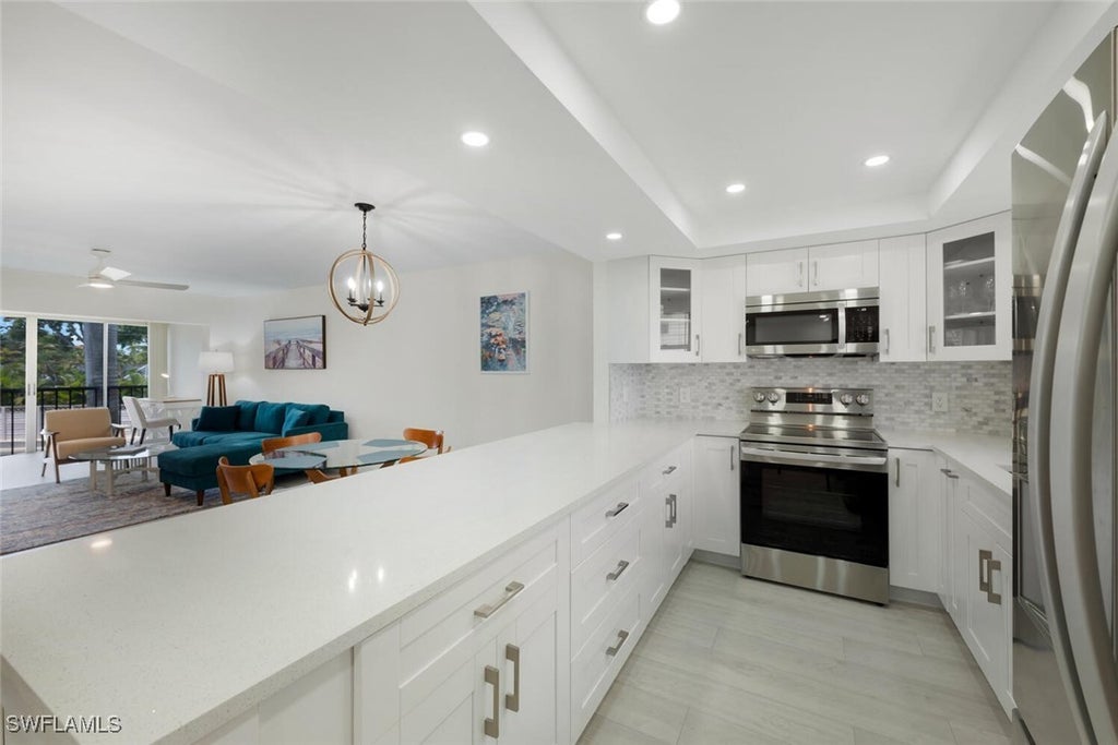 TURNKEY!! Golf membership & country club amenities included with purchase, plus TWO assigned parking spaces. Fabulous investment opportunity, with lease in place Feb-April 2026 for $5,500/month!! Rent up to 6 times a year, for a minimum of 7 days! Seasonal rate $5,500/month (Dec-May) and $2,500/month (June-Nov). Golf & amenitites transferrable to Renters! Total renovation of larger 2 bedroom, 2 bath condo, with enclosed triple lanai, creates much more living space than most condos in High Point CC. Featuring white cabinetry & white quartz countertops throughout, stainless steel appliances & ample storage space in the kitchen, larger bathrooms than most condos in High Point & laundry room in residence. Light colored, wood-like tile runs tihroughout & it's furnished with blue, green & white decor. There's a storage room next to the unit, as well as a common elevator. High Point CC is a fun, very social community, located in the Heart of Naples, close to dining, shopping, beaches, health care and entertainment. THIS CONDO IS ALREADY LEASED FOR FEBRUARY - APRIL 2026. New owners must honor the lease.