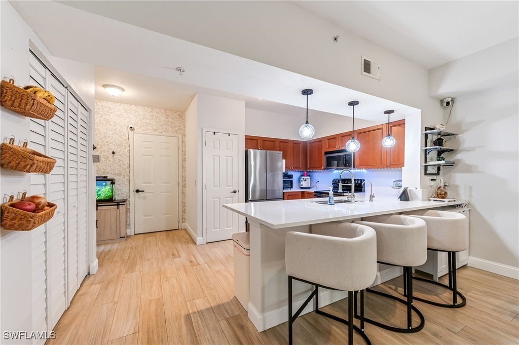 Welcome to this stunning 2-bedroom, 2-bathroom condo with an attached garage, perfectly nestled in the highly sought-after gated community of Villagio at Estero. This stylish, move-in ready home offers a spacious open-concept layout that seamlessly blends comfort and sophistication .Tastefully updated tile floors that emulate the warmth and texture of white oak wood, creating an elegant yet inviting space to relax and entertain. Kitchen featuring a gorgeous peninsula with quartz countertops, matching quartz backsplash, and sleek stainless steel appliances, a spacious master bedroom with custom walk-in closets . This residence is offered furnished ready for you to enjoy from day one . Also available for seasonal rental. Inquiries are welcome . Villagio at Estero boasts an exceptional array of amenities at the vibrant Town Center, including a Café, movie theater, fitness center, newly renovated pickleball and tennis courts, resort-style swimming pools and spa overlooking the water to enhance your lifestyle and provide year-round enjoyment. The Villagio community has a fresh new look with Brand new roofs and freshly painted exteriors .Residents enjoy 24-hour gated security ,low condo fee which includes water, premium cable with DVR and voice remotes and high-speed internet . Don’t miss your chance to own a piece of paradise in one of Estero’s most coveted communities!