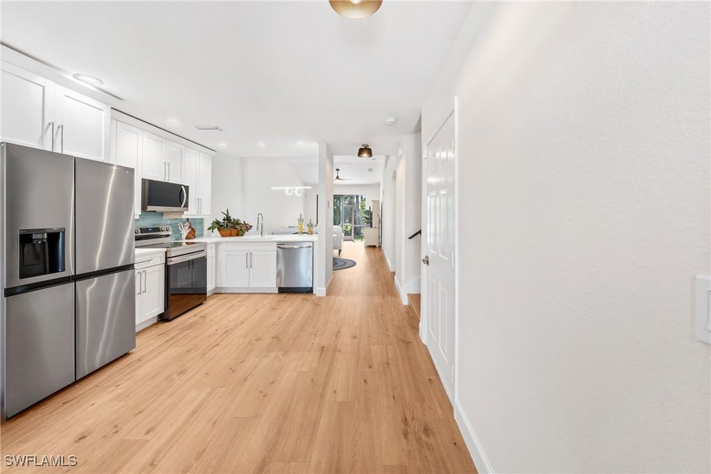 We introduce 7745 WOODBROOK CIR #3702 to you! This stunning and recently renovated 3 bedroom and 2.5 bath 2-story townhome in the Preserve at the Shores of Berkshire Lakes, a gated community in Naples! This very special unit was renovated from top to bottom and with brand new luxury engineered laminate and tile flooring (in the bathrooms) throughout, fans, and renovated bathrooms! From the enclosed entryway, leave the front and back doors open to allow that beautiful cross breeze in! From the entryway, enjoy the updated kitchen complete with quartz counters, stainless steel appliances, a contrasting and stunning backsplash, large sink, pantry, and tons of storage. Past the kitchens breakfast bar, your dining and living area open up to a vaulted ceiling allowing TONS of natural light. Your enclosed lanai is a treat with privacy and views of beautiful Florida flora and fauna. The master suite, located on the first floor, is your retreat with dual sink, walk-in closet, and luxury shower with built in shelving. Your out of town guests will feel right at home upstairs with 2 additional bedrooms and full bath. Each guest bedroom is large with plentiful closet space and natural light. Peace of mind is enhanced with your one car attached garage, laundry in residence, impact resistant windows, manual storm shutters, fresh paint job, a 2022 roof, and close proximity to fantastic A+ schools! This location at enjoys close proximity to Santa Barbara Blvd, allowing for quick and easy access to I-75, Davis, & Radio Rd with a short 15 minute drive to Lowdermilk Beach and famed downtown Naples!