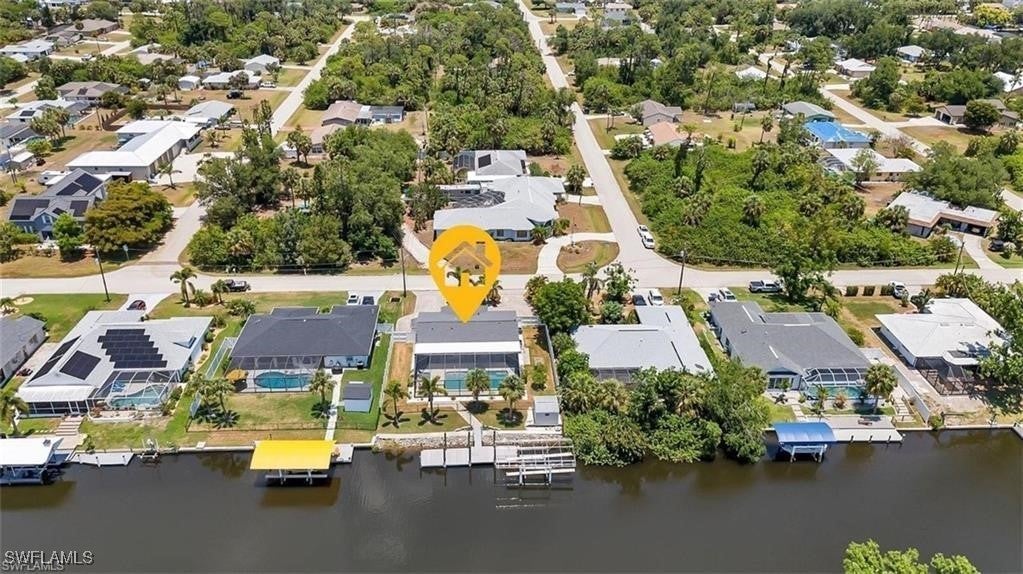Indulge in waterfront living with southern exposure!! Charming 2-bed, 2-bath heated pool home, offering a comfortable 1,288 square feet of living space. Enjoy the convenience of CITY WATER! Upon arrival, you'll be greeted by a circular paved driveway leading to a one-car garage, adding to the home's curb appeal. The air-conditioned garage features an R-19 insulated door with an automatic deadbolt latch and a side-direct drive opener, ensuring both convenience and security. The double-entry, screened-in front lanai, secured by impact-resistant French doors, sets a welcoming tone. Inside, the living spaces blend seamlessly with the outdoors, courtesy of large windows that usher in natural light. Home features tile flooring throughout. The living room flows into the dining area, which offers access to lanai through the sliding doors. The kitchen is equipped with solid surface countertops, NEW dishwasher, kitchen sink features reverse osmosis, and ample of cabinet space. The master bedroom boasts a walk-in closet, Impact sliders to the lanai, and a private bath with a single sink and a beautifully tiled walk-in shower. The guest bedroom offers comfort and convenience, complemented by a guest bathroom featuring a shower/tub combo. The inside laundry room includes a washer and dryer, utility sink, desk, and additional storage closet. Step outside to discover a backyard paradise, featuring a sparkling heated pool with enchanting light features to illuminate your evenings, ensuring year-round enjoyment and an oversized lanai perfect space to entertain family & friends. Imagine spending warm summer days lounging by the pool or watching sunsets, creating memories that will last a lifetime. Fishing enthusiasts will appreciate the 80' of water frontage with concrete seawall with riprap protection, 10,000lb boat lift, and a high-quality 10X40 Trex dock equipped with electric & water. This home offers direct access to the waterways with one bridge out to open water, making it a boater’s dream. YOUR backyard area is enclosed by a vinyl fence, providing privacy without obstructing the view, while a separate chain-link back adds extra security for your pets. The outdoor space is further enhanced with exquisite landscaping, an irrigation system to maintain the lawn, and a brick paver walkway that winds through the backyard to the side of the house. Bonus shed for extra storage. This home is a true gem, blending comfort, and a prime waterfront location. Experience peace of mind with recent upgrades including: Roof "2022", Hot Water Heater "2024", Garage door replaced "2020"and Impact Windows/Doors "2019". No deed restrictions and not located in a HOA. This home is conveniently located in a nice neighborhood but close to restaurants, shopping, beaches and much more!!! Don’t miss the opportunity to own this beautiful waterfront pool home, where every day feels like a vacation! Ask to see this one first...make YOUR appointment today!!!