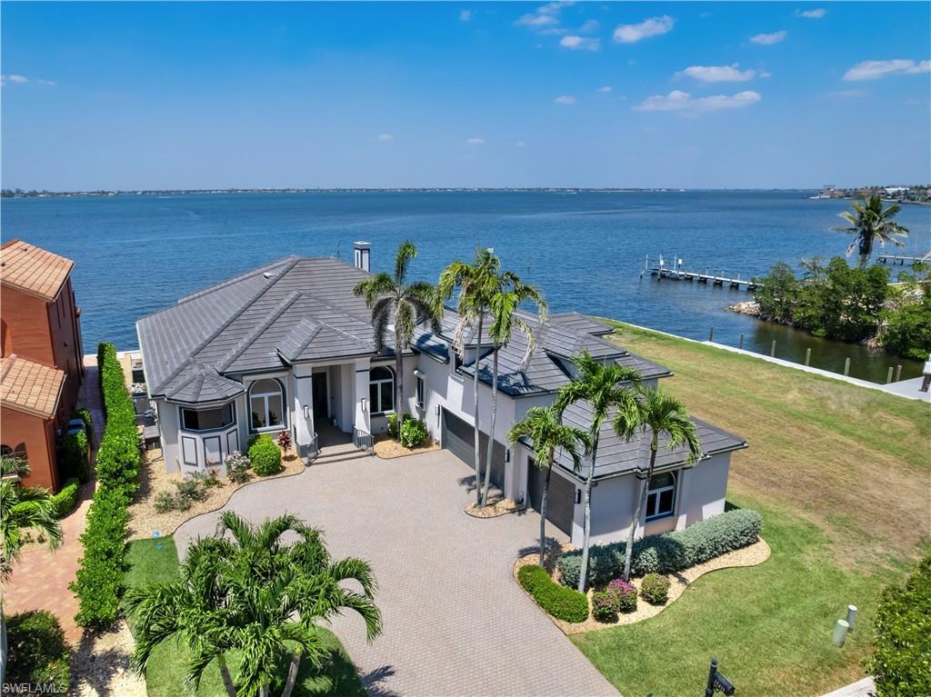 Luxurious Waterfront Living in the Prestigious Gated Community of Catalpa Cove. This beautifully updated estate offers over 3,500 square feet of refined living space with 4 bedrooms, 4.5 bathrooms, plus a private 1 bedroom, 1 bathroom guest suite with a partial kitchen—perfect for visitors, or a secluded workspace. From the moment you step through the front door, the home welcomes you with soaring ceilings, Great natural light, and stunning river views that stretch across the formal living and dining areas. The gourmet kitchen is both spacious and functional, featuring extensive counter space and an open layout that flows seamlessly into the family room—ideal for entertaining or everyday living. The VIP suite is thoughtfully positioned for privacy and showcases expansive water views, a spa-inspired bath, and generous closet space. Each additional bedroom includes its own ensuite bathroom, creating a private and comfortable space for family and guests alike. Outdoors, the home truly shines. An oversized paver lanai frames a saltwater infinity-edge pool and spa, offering a peaceful escape surrounded by breathtaking waterfront scenery. The attached guest suite, located just off the lanai, can also serve as a convenient pool bath. Boaters will love the private dock outfitted with a 16,000 lb. lift, power, and water connections, alongside a raised seawall and approximately 80 feet of direct river frontage. Recent updates add to the home's value and peace of mind: a 2022 roof, 2-zone HVAC with dehumidifier and UV purification (2021), Storm Smart Kevlar storm screens, new exterior and interior paint, upgraded irrigation running on a private well, and a dual propane tank setup with generator-ready electrical panel. Best of all, this home remained high and dry—no water intrusion in either the main residence or garage during any storms. Located just minutes from fine dining, marinas, and the white-sand beaches of Sanibel and Captiva, this is a rare opportunity to own a truly turn-key waterfront residence in one of Southwest Florida’s most sought-after communities.