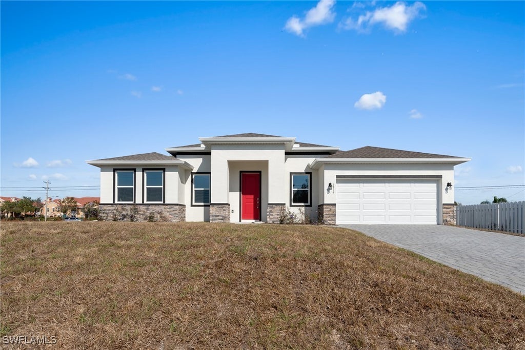 New Construction Energy Efficient Home in Cape Coral. Room for everyone with 1,663 SF Living Area. Just Finished and packed with over $20,000 in features including an upgraded appliance package, spray foam insulation, a brick paver driveway, a hybrid water heater, and prewired solar panel ready. Featuring 3 bedrooms, 2 bathrooms, and a 2-car garage. Open floorplan with vaulted 9’4” ceilings throughout and lots of windows for natural light. The kitchen is open to the main living areas. It features brand-new energy-efficient appliances, granite counters, a pantry, a center island with bar-top seating, and a dining area overlooking the backyard. Relax in the spacious living room overlooking the lanai and backyard out of the sliding glass doors. The master bedroom offers a nice retreat, and the master bathroom includes a walk-in closet, dual vanity with granite counters, and a walk-in shower. Neutral flooring and 3 ¼ baseboards throughout. The spare bedrooms are large and offer great space for families, guests, or a home office. The lanai is the perfect place to enjoy the Florida weather and BBQ and enjoy evenings and weekends in your private backyard paradise. Enjoy the upgrades and savings every month from this Department of Energy Zero Energy Ready Home with insulation, LED lighting, 50 Gal Hybrid Heater, 16 Seer variable speed A/C, Wi-Fi thermostat, Low-E vinyl dual pane windows, and Energy Star Appliances. For an additional cost, the home can be delivered with Solar Panels you own – no separate loan – for no electric bill or significant savings. Not your typical Cape Coral Home – this includes several upgrades, savings, and smart features you will not find with other houses. Located near the future 7 Islands may include restaurants, shopping, marinas, a park, green space, and possibly even a beach area! BOATERS are located near several public boat launches/ramps and Matlacha for Gulf Access, open water, world- famous fishing, beaches, and barrier islands. GOLFERS - Very close to Palmetto Pines Country Club and Coral Oaks. Close to shopping, dining, events, Starbucks, Target, Publix, and the area’s top-rated restaurants.