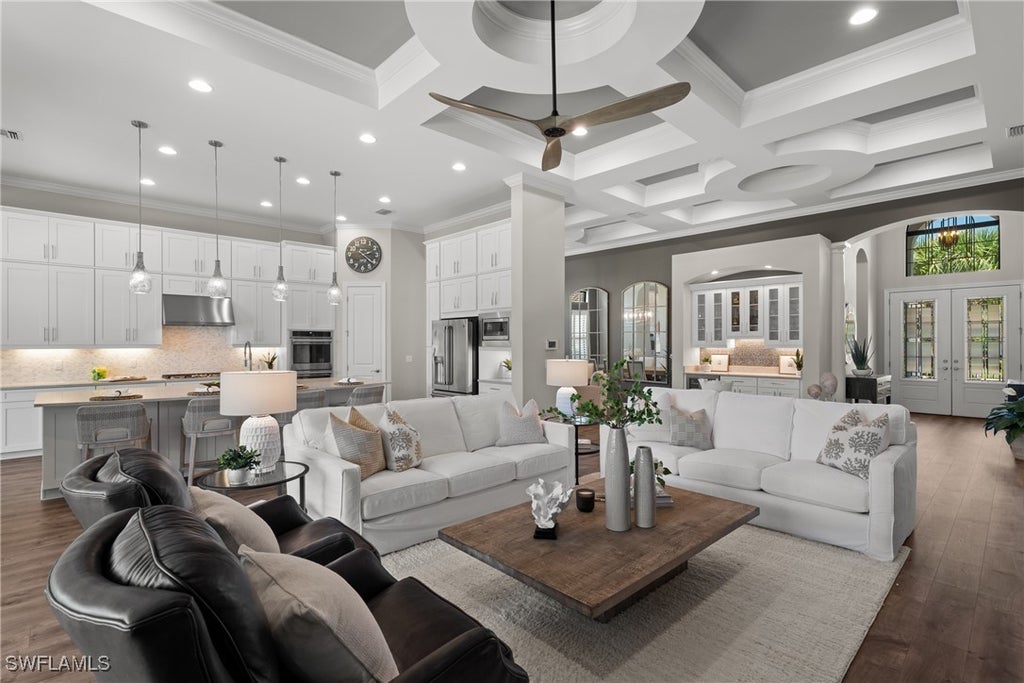 LIVE A VACATION LIFESTYLE IN ESPLANADE! FULL GOLF MEMBERSHIP INCLUDED! This immaculate “Francesco" (3 Bedrooms+Den, 3.5 Baths, 3 Car Garage) features nearly 2,900 sq ft of living space under air and has been lovingly cared for by its original owners. From the moment you enter the home through the double glass front doors, you are greeted with an open great room style floorplan with 12' ceilings throughout each room of the home with an abundance of windows & additional transom windows, wood floors throughout the common areas, den & bedrooms, impressive coffered style tray ceilings, and two sets of pocketing sliding glass doors to the extended lanai complete with outdoor kitchen & bar, GAS heated salt water pool/spa/sunshelf, and picture window screen cage overlooking the lake. The spacious kitchen lends itself to entertaining with an oversized island, shaker style cabinetry, quartz countertops, GE Cafe appliances including GAS cooktop & double wall ovens, abundance of cabinetry included 24” upper cabinets to complete the high end look. The den serves as a bonus living space and is outfitted with built-in cabinets including two twin murphy beds for overflow guests. You will be sure to catch sunsets 365 days a year from this home’s west facing rear exposure overlooking the lake. For a peace of mind, this home features a mix of hurricane impact windows, motorized roll down hurricane shutters, and accordion hurricane shutters on all openings. A long list of special features include: ELECTRIC ROLL DOWN HURRICANE SCREENS/SHUTTERS on the lanai; custom outdoor kitchen and bar complete with grill, hood, sink, and refrigerator; upgraded climate controlled garage with finished floor & cabinetry; custom closet cabinetry & shelving throughout; dry bar with beverage cooler; plantation shutters; landscaping lighting; crown molding; and more! Esplanade Golf & Country Club of North Naples offers a true “Lifestyle Community” with world-class amenities, including a resort pool with cabanas and the popular “Bahama Bar,” tennis, pickleball, bocce, a 14-mile network of bike/walking trails, and an 18-hole private golf course. The impressive 15,000 Sq Ft clubhouse features a restaurant, bar, wine-tasting room, wine lockers, and a Starbucks-style café. Best of all, the property’s landscaping, irrigation, golf membership, and all community amenities are covered under a quarterly fee of just $3,434—no additional fees or memberships required! Don't miss your opportunity to own this exceptional home in one of Naples’ most sought-after communities. Schedule your tour of this stunning home and Esplanade Golf & Country Club today!
