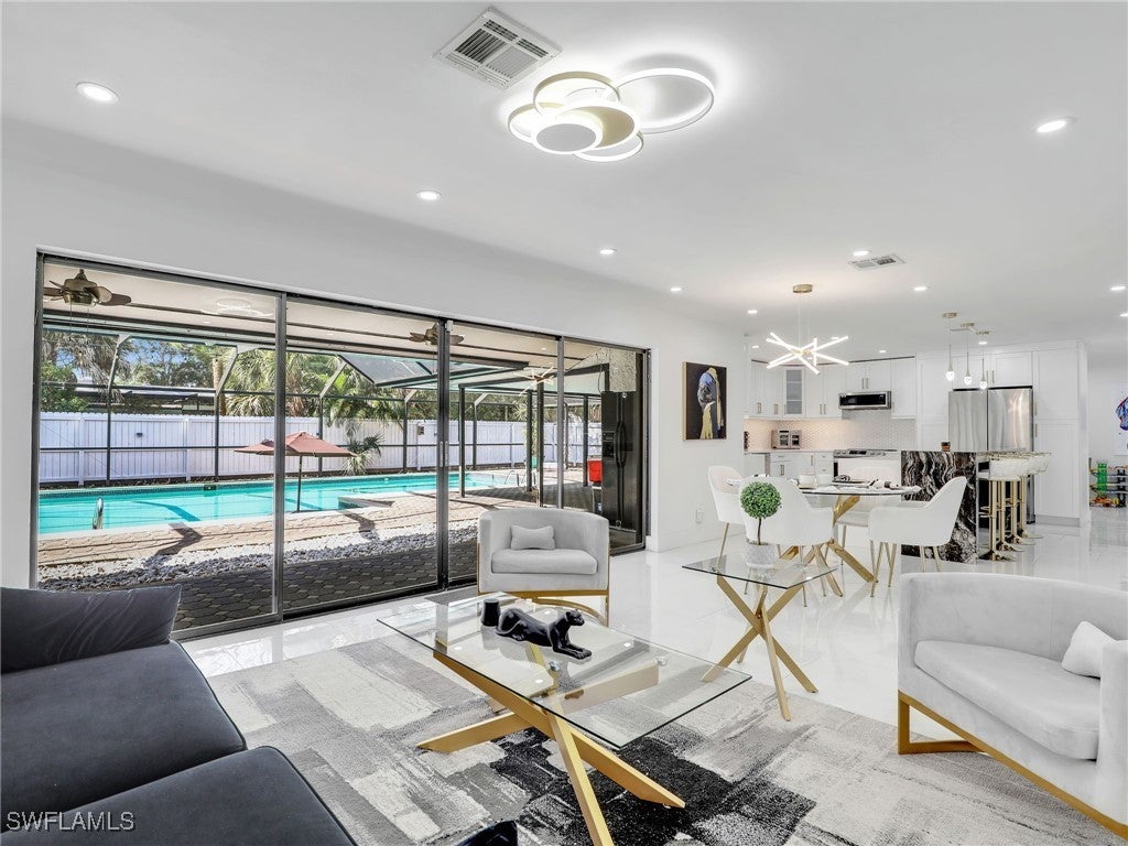 PARADISE FOUND IN THE HEART OF NAPLES — NO HOA, NO RESTRICTIONS! Step into this upgraded 3-BEDROOM, 2-BATHROOM POOL HOME offering luxury, flexibility, and unbeatable location. Just minutes from world-famous beaches and top dining, this home sits in one of Naples’ most desirable areas. Built to last with CONCRETE BLOCK CONSTRUCTION, this home offers strength, durability, and peace of mind in any season. Inside, you’ll find a sleek OPEN-CONCEPT LAYOUT filled with NATURAL LIGHT and ELEGANT PORCELAIN TILES throughout. The chef’s GOURMET KITCHEN shines with QUARTZ COUNTERTOPS, a striking QUARTZ + GRANITE WATERFALL ISLAND, and premium finishes perfect for entertaining. The SPACIOUS MASTER SUITE features a WALK-IN CLOSET and a fully RENOVATED ENSUITE BATHROOM with QUARTZ COUNTERS and a MODERN WALK-IN SHOWER. Both bathrooms offer SLEEK, CONTEMPORARY UPGRADES. Need extra space? The FLEX ROOM is ready to become your office, gym, or lounge. Step out to your SCREENED-IN POOL AREA, an entertainer’s dream with ADDITIONAL LOT SPACE FOR YOUR BOAT OR RV. Extras include a LARGE CIRCULAR PAVED DRIVEWAY, TWO-CAR GARAGE, and a NEW ROOF (2019). Located in a TOP-RATED SCHOOL DISTRICT and only 5 minutes from I-75, this home checks every box for lifestyle and investment. THIS IS YOUR SLICE OF PARADISE—READY TO MOVE IN AND ENJOY.