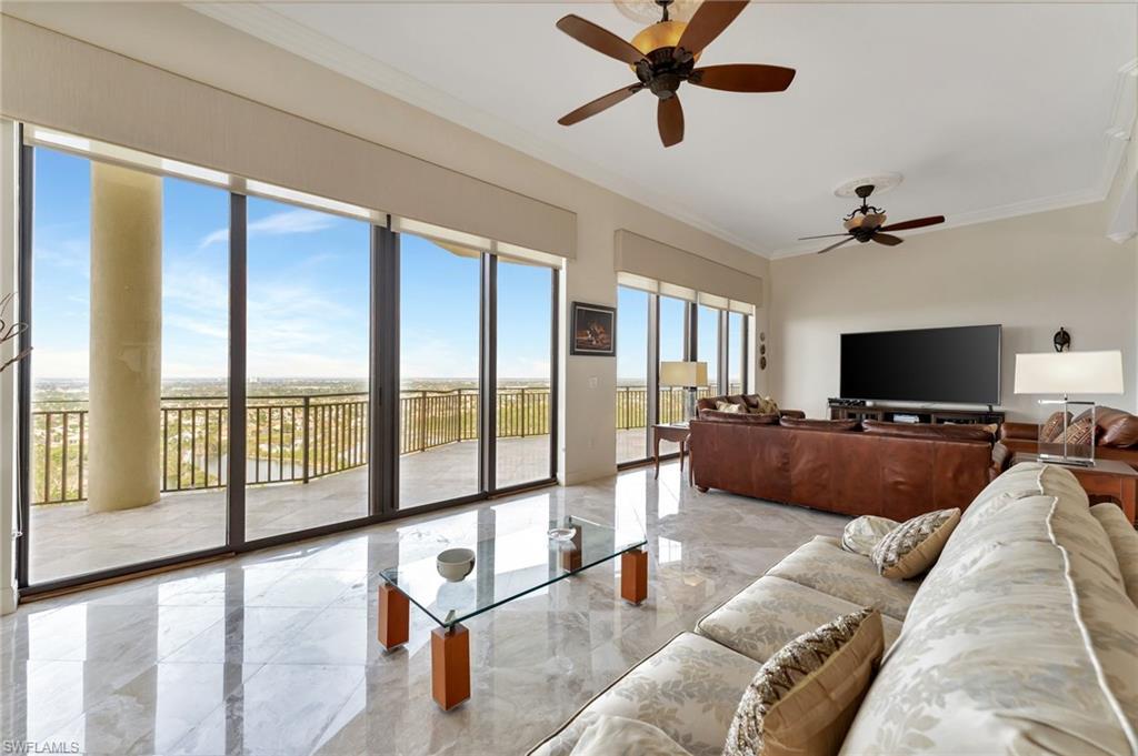 Magnificent home and a rare opportunity! Penthouse at Riva Del Lago an unparalleled value you won't find elsewhere - wall to wall marble and furnished! Situated on the 21st floor, it treats you to breathtaking views that change like a masterpiece with each evening's sunset. Enjoy the spacious 1,600 sq ft wrap-around lanai with expansive vistas extending to Sanibel, Ft. Myers Beach, and Estero. Nearly 4,000 sq ft under AC, Great room floor plan boasts volume ceilings, crown moldings, and floor to ceiling glass Impact sliders and windows that embrace the natural beauty outside~ incredible! This elegantly appointed home features wall-to-wall marble floors, illuminated art niches, extra wide hallways, solid core 8 ft doors, and a grand foyer and den. With only two homes on this level, privacy is paramount. Indulge in resort-style amenities including an invisible edge pool, tennis courts, billiards/media room, library/card room, hobby room, conference room, office center, and a large web equip fitness center. Kayak storage and launch ramp offer opportunities to explore the park's lakes. Private, gated access into Lakes Park enhances outdoor activities, including visiting the weekly Farmer's Market. Convenience is key with shops, restaurants, beaches, and the airport nearby. This penthouse comes with two premium deeded parking spaces, a large storage room, and ample guest parking. Plus, it can even accommodate electric vehicles*. Don't miss this rare chance to own your slice of paradise.