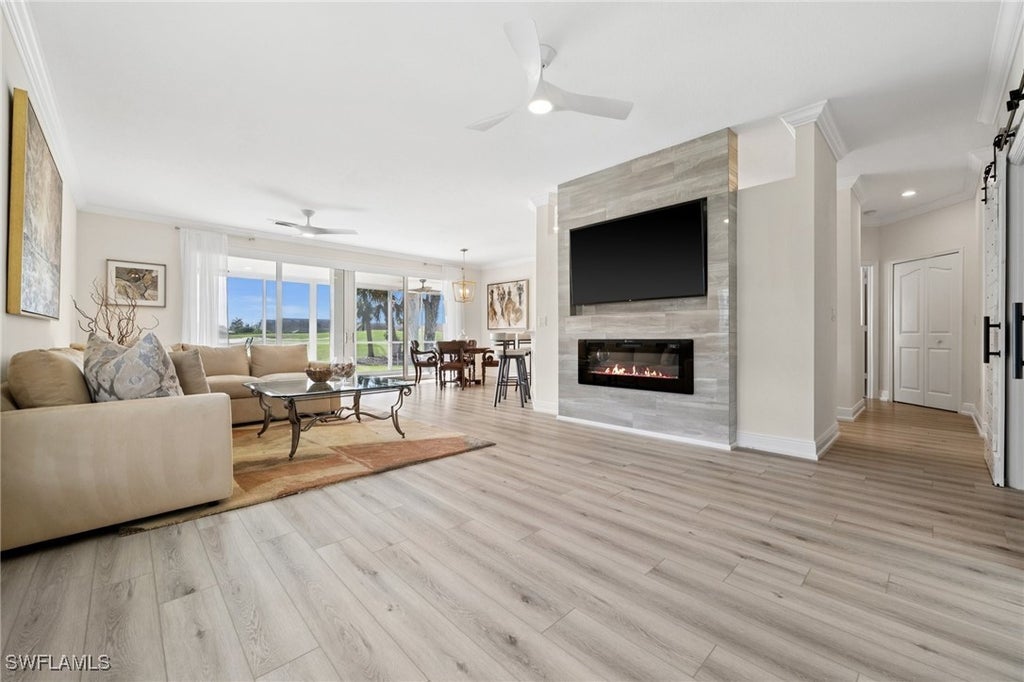 Feel like your on vacation as you step into this beautifully updated first-floor end unit, offering breathtaking golf course views. The condo boasts lots of natural light and features custom light fixtures and fans, alongside stylish wood plank-style tile and luxury vinyl tile flooring throughout. Elegant plantation shutters add a touch of sophistication and privacy to the space. For your convenience and peace of mind, the property is equipped with electric shades on the sliders, an electric fireplace, and hurricane impact windows and sliders. The spacious lanai, fitted with Lexan panels and portable AC, extends your living space, allowing you to relax in comfort while enjoying the stunning views. This well-maintained community, surrounded by lakes and lush greenery, promotes an active lifestyle with a variety of resident events and amenities including a pool/spa and bocce court. Located in an ideal North Naples area, this property offers easy access to pristine beaches, shopping, and dining offering the perfect setting for both relaxation and leisure.