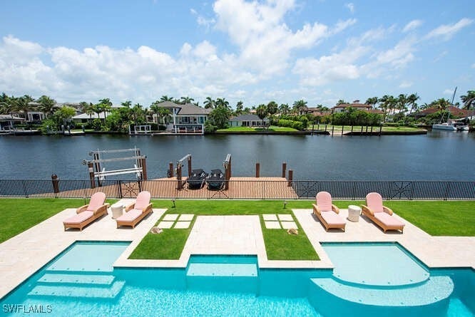 First time on the market. This is a beautifully designed custom-built home on one of Aqualane Shores premier locations a short distance to the beach and historic Old Naples’ 3rd Street shops and dining. Positioned on the second widest canals, ideal for maneuvering even a large boat and boasting a rare 148' feet of linear water frontage, this property offers ample opportunity to enjoy direct, unrestricted access to Naples Bay and the open waters of the Gulf. The interior design by Collins Dupont is both elegant and timeless while personifying the perfect Naples beach home. With 6,774 square feet under air and 12,552 square feet under roof, this comfortable home offers generous, well-proportioned spaces and a flowing floor plan filled with an abundance of natural light and stunning views from every room. Perched on a high elevation, this concrete block home with poured concrete floors offers exceptional structural integrity. The ground floor features a circular driveway, two oversized garages with space to accommodate 4+ vehicles, and a vast open area leading to the covered lanai, resort-style heated saltwater pool and spa, and an expansive summer kitchen. The primary suite with dual water closets, a guest suite, and the den are all located on the first floor of living. The gourmet kitchen has a large center island, butler’s pantry, and sweeping waterfront views. The top floor has 4 large ensuite bedrooms and a 400+ square foot game room leading out to a large balcony overlooking the Aqualane Shores waterfront. This stunning residence possesses every feature you would expect in a home of this magnitude including a 48KW whole house generator (connected to natural gas lines), a newly installed latest version Control4 home automation system to run almost every function of the home remotely, roll down screens and shutters, and elevator access to the entire home. This residence is designed for those who value exceptional craftsmanship and custom design. According to the Flood Elevation Certificate the first floor living is 15'7". Furnishings and watercraft are negotiable.