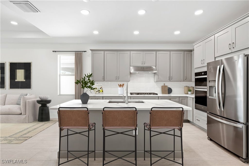 Discover the pinnacle of refined coastal living in this brand-new, beautifully crafted paired villa, ideally located in one of Naples’ most sought-after communities. This move-in ready residence offers a harmonious blend of elegance, comfort, and modern convenience across 1,601 square feet of thoughtfully designed living space. From the moment you step inside, you’ll appreciate the expansive open-concept layout and sleek tile flooring throughout, combining a clean, contemporary aesthetic with effortless maintenance. At the heart of the home lies a chef-inspired kitchen, featuring gleaming quartz countertops, wood cabinetry with soft-close features, and a full suite of stainless steel appliances—perfect for everyday meals or entertaining in style. The adjacent dining area flows seamlessly into the spacious great room, creating a light-filled environment ideal for both relaxed living and hosting guests. Retreat to the serene primary suite, where you'll find a generous walk-in closet, and a spa-like en-suite bath complete with quartz countertops, custom cabinetry, dual vanities, and a luxurious walk-in shower. Step outside to your private covered lanai—an inviting outdoor space ideal for alfresco dining and embracing the Florida lifestyle. As a resident of this exclusive Naples community, you are just steps away from access to a world-class amenity center, including a resort-style pool, state-of-the-art fitness facility, and a beautifully designed clubhouse. A dedicated lifestyle director curates year-round events and activities to enrich your experience. Don’t miss this opportunity to own a slice of paradise in Naples. Schedule your private tour today and experience luxury coastal living at its finest. Please refer to MLS supplements for detailed interior design selections and floor plan. Lot 21. Don’t miss our special rate buydown incentive—ask your sales consultant for details today!