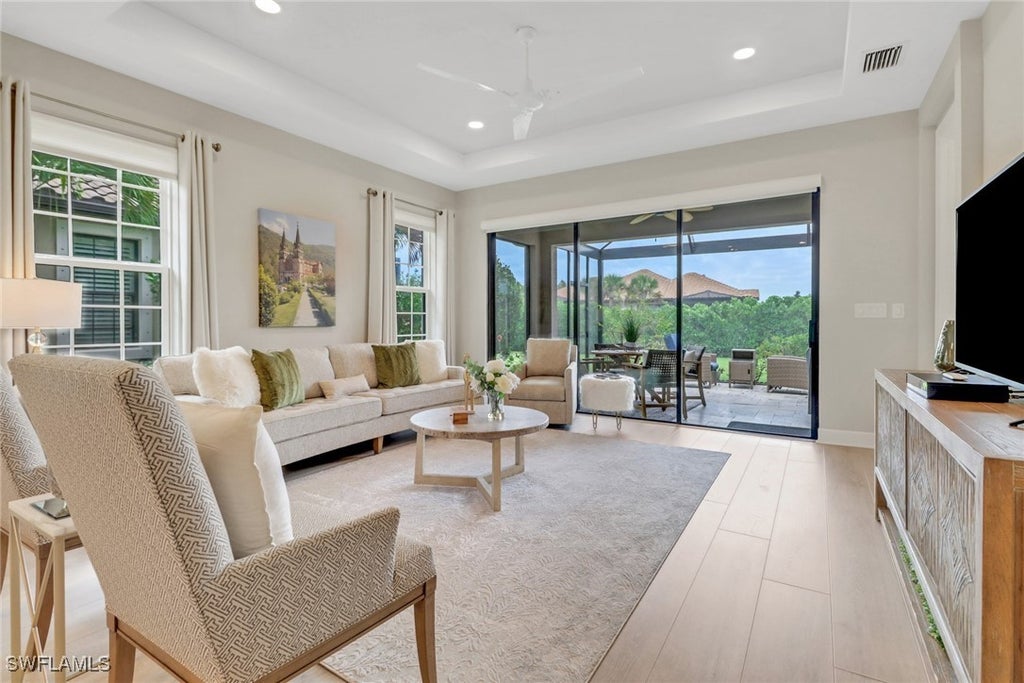 Step into a life of luxury at Esplanade by The Islands, one of Naples' newest premier gated lifestyle communities where resort-style living meets everyday comfort, all with low HOA fees. Ideally situated just minutes from both downtown Naples and Marco Island, this private community gives you the best of both worlds: tranquil seclusion with easy access to beaches, shopping, dining, and culture. This Mazzano one-level attached villa offers the perfect blend of elegance and function. Featuring 2 spacious bedrooms, 2 bathrooms, a versatile study/den, and an extended screened lanai, this home is designed for both entertaining and unwinding lifestyle. The fully furnished bright, open-concept layout welcomes you with tray ceilings, 8 foot doors and a seamless flow between the kitchen, dining area, and gathering room. Highlights include: • Quartz countertops, natural gas stove, and pendant lights • Extended lanai with picture window screen and gas grill • Owner’s suite with dual vanities, a private water closet, walk-in shower, and a walk-in closet • Private guest suite with direct bath access • Double pocket doors to the study/den for added privacy if extra sleeping room is needed • Laundry room with utility sink and storage • Pre-plumbing for an outdoor kitchen + gas grill hookup; current gas grill stays with home • Beautiful brick paver driveway and 2-car garage Why wait for new construction? This resale gem comes with valuable upgrades, fully furnished and significantly lower fees than building. Unwind at the full-service spa and salon, grab dinner and drinks at the on-site restaurant, or fill your calendar with wine tastings, live concerts, wellness events, and more. Whether you're into tennis, pickleball, bocce ball, or yoga, there's something for everyone. Don’t miss this opportunity to make every day feel like a getaway. Schedule your private showing today!