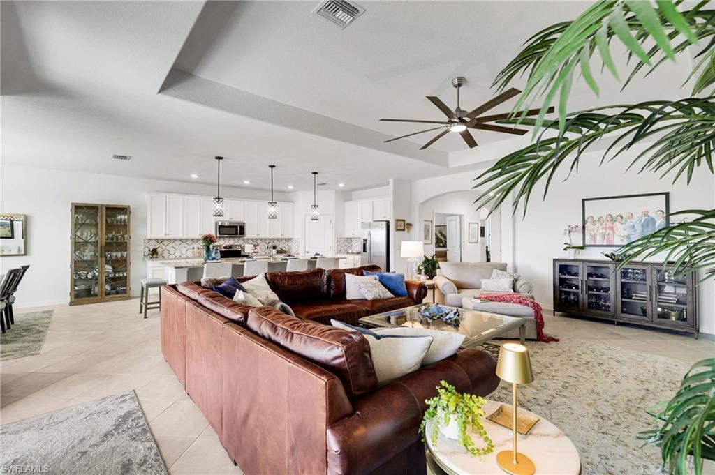 Experience luxury living at its finest in this modern, single-story Summerville II home, nestled within the gated community of Portico in Fort Myers. This open-concept home, decorated in a neutral color palette and soothing tones, offers 2,445 SQUARE FEET of living space featuring 3 BEDROOMS PLUS DEN and 3 FULL BATHROOMS, creating a harmonious blend of elegance, functionality, and comfort. Step into the bright and inviting foyer through DOUBLE GLASS INSERT FRONT DOORS that provide an abundance of natural light. The OPEN CONCEPT great room is perfect for family living and entertaining. The large kitchen is a chef's dream, featuring an OVERSIZED CENTER ISLAND with seating, gorgeous designer lighting, prep counter, ample storage, walk-in pantry, white cabinetry with 42” upper cabinets, CUSTOM DESIGNED ITALIAN MARBLE BACKSPLASH, granite countertops, and stainless-steel appliances. The living room, with its elegant TRAY CEILING, seamlessly connects with the kitchen and formal dining area. Other notable features include a 3-CAR GARAGE WITH EPOXY FLOORS, TILE FLOORING THROUGHOUT, NEW FRONT-LOAD WHIRLPOOL DUET WASHER AND DRYER, a UTILITY SINK, and a den/office with French doors. The secondary en-suite bathroom boasts a frameless sliding glass shower door, and there's additional paved patio space for outdoor enjoyment. The thoughtfully designed SPLIT FLOOR PLAN ensures privacy for each bedroom. The primary suite offers a serene retreat with a spacious, light-filled bedroom, private access to the lanai, tray ceiling, designer chandelier, TWO WALK-IN CLOSETS, and a well-appointed en-suite bathroom featuring dual counters/sinks, a separate water closet, and a massive walk-in shower. Two additional bedrooms, located at the front of the home, provide ample space and privacy for the entire family. This amazing waterfront home encompasses a generous 0.20-acre cul-de-sac lot with serene LAKE VIEWS and a screened lanai. Its east rear exposure provides stunning sunrises to complement your perfect piece of paradise. This home offers plenty of space for you to design and create your own personal outdoor pool and spa oasis. Residents of Portico enjoy resort-style amenities, including a clubhouse, community pool, fitness center, movement/exercise room, pickleball, tennis and basketball courts, and a children’s park. Pets, fences, and low-speed vehicles are permitted. With its well-appointed amenities, low HOA fees, prime location in a NO FLOOD ZONE in Fort Myers, and convenient access to shopping, dining, and entertainment, this home truly has it all. Lennar is currently sold out of 3-car garage home lots in Portico, making this a great opportunity! Don't miss the chance to make this exceptional property your new home. Schedule your private viewing today before this gem is gone!
