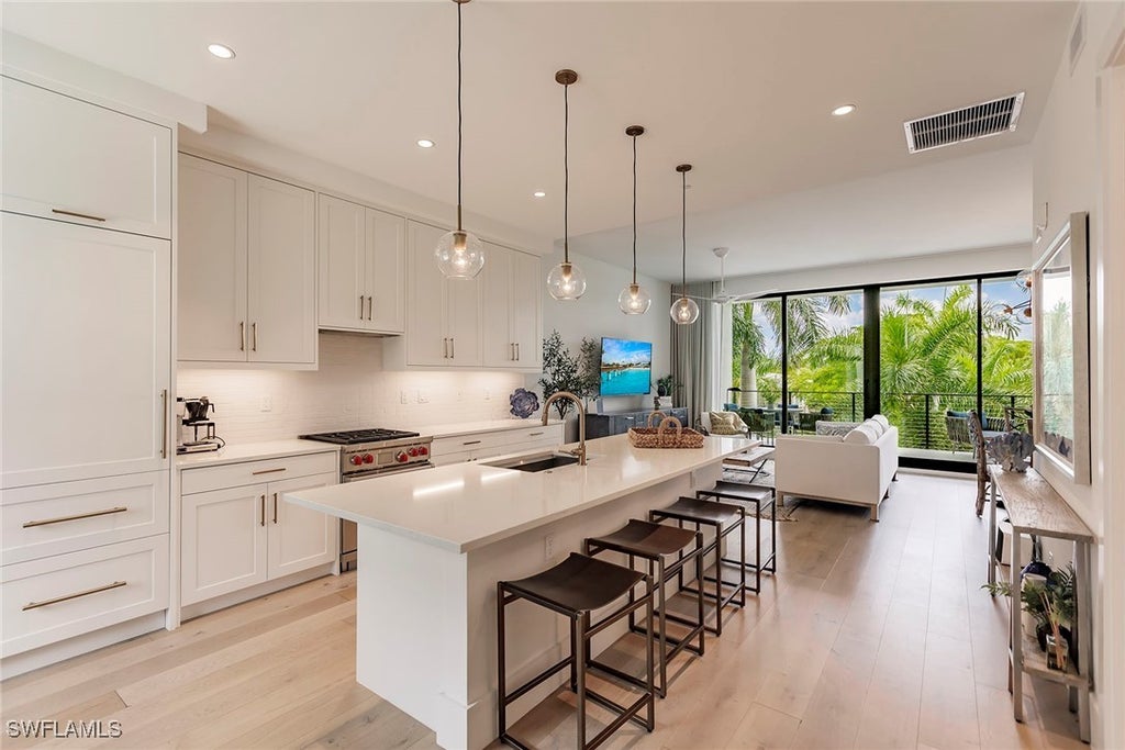 Beautifully appointed 2-bedroom, 2-bathroom condo in the vibrant heart of Naples, FL. This modern and elegant unit offers a perfect blend of comfort, style, and convenience. Sleek kitchen features high-end stainless appliances and oversized island with counter seating. The well-designed floorplan maximizes space and natural light with a comfortable main living area boasting large flat screen TV and full-size dining area. Expansive sliders open to your private balcony with additional dining and lounge seating. Primary bedroom is thoughtfully designed with a king bed, workspace, and en-suite bathroom. Guest room features a queen bed, views of the pool, another workspace and easy access to a second full bath. Laundry in unit. Sparkling community pool on the 2nd floor of the building adjacent to a grassy common area with hammocks for relaxing in the sun without leaving the property! Venture upstairs to the 4th floor of the building for access to a community outdoor kitchen with dining/lounge space with gas firepit! Everything you could desire and more - shopping, dining, art, parks, beaches, nightlife etc. - all within steps from your front door. Covered parking garage in building.