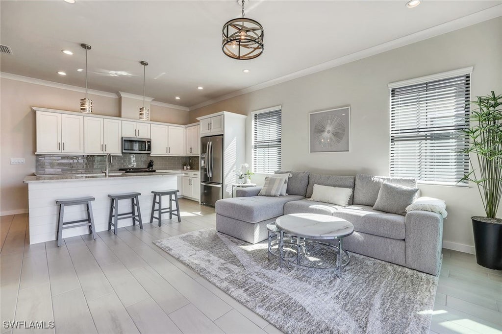 GREAT PRICE for a 4 Bedroom + Loft / 3 Bathroom home in the desirable Abaco Pointe community! Come and see this large two-story home with a Chef's Kitchen with beautiful shaker cabinets, stainless steel appliances, Quartz countertops, Natural gas cooktop, a Large Island with seating, and a casual dining area off to the side. Upon entering the front door, a large living area with a vaulted ceiling to the second floor. The Master Suite has a walk-in closet and the Master Bathroom has dual sinks and a large shower. The first floor also has another bedroom, full bath, and a laundry room. The second floor is comprised of 2 additional bedrooms, a full bath, and a Loft area. The two-car garage comes with epoxy flooring. The home has Impact-resistant windows and doors and has window coverings throughout. Covered lanai has a built-in grill area and looks out onto the spacious backyard with room for a Pool. Abaco Pointe is a small community with low HOA fees, a Clubhouse with an exercise room, and a community Pool and Spa. It is located close to the new Founder's Square with many dining/shopping options and it is close to many top-rated schools. And within miles to Naples' finest beaches.