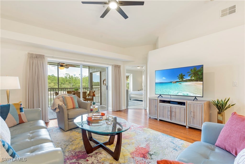 Stunning water and golf course views from this renovated corner veranda! Welcome to your slice of paradise overlooking the picturesque 12th hole at Naples Heritage. This beautifully renovated corner unit offers expansive lake and golf course views and features the largest veranda floor plan in the community. With soaring vaulted ceilings and an open-concept layout, the home is flooded with natural light and designed for both comfort and entertaining. The kitchen showcases quartz countertops, elegant cabinetry, a sleek sink, and updated appliances. A built-in bar area with beverage fridge adds a sophisticated touch, perfect for hosting friends and family. The spacious primary suite features bay windows overlooking the golf course, dual walk-in closets, and a luxurious bathroom complete with a walk-in shower, and an extended dual-sink vanity with quartz countertops. This sought-after floor plan includes a private guest wing, a den ideal for a home office, or third bedroom, and a stylish guest bathroom with quartz vanity and step-in shower. Enjoy indoor-outdoor living with two generously sized lanais, both newly tiled—perfect for soaking up the Florida sunshine or watching the action on the par-3. Additional features include hardwood and luxury vinyl plank flooring throughout, a brand new Maytag washer and dryer, and a one-car garage. Offered furnished and turnkey, this home is move-in ready—just bring your suitcase and toothbrush! As a resident of Naples Heritage, you'll enjoy access to a full golf membership to this premier bundled golf community. The 18-hole, Gordon Lewis-designed course offers a variety of golf leagues, clinics, and tournaments. But the amenities don't stop at golf! Naples Heritage also features four pickleball courts, six tennis courts, a fitness center with a wide range of classes, bocce, and poolside dining at the Palm Terrace overlooking the resort-style pool. The main clubhouse offers additional dining options, and there are countless social events throughout the season to keep you connected with the vibrant community. The location couldn’t be more convenient—just 15 minutes to downtown Naples, with quick access to I-75 for easy trips to the airport or south to Marco Island. Don’t miss out on this incredible opportunity to own your slice of paradise. Don’t miss this incredible opportunity—schedule your private showing today!
