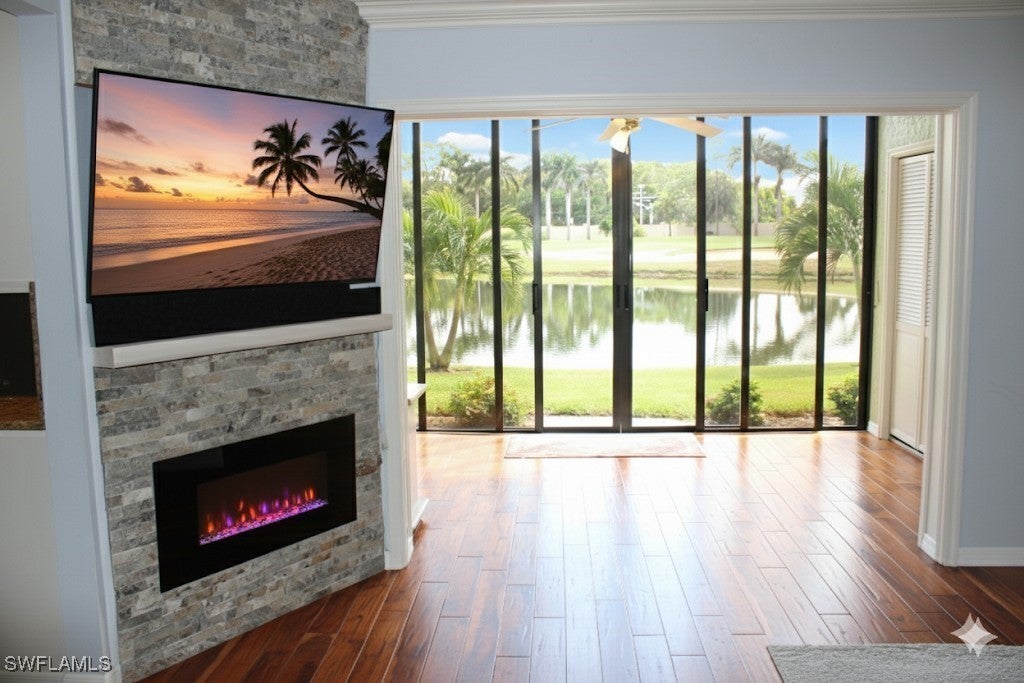 NO FLOOD ZONE! IMPACT RESISTANT WINDOWS! NEW 2025 AC and condenser. This beautifully upgraded first-floor, 2 bedrooms, 2 bath condo is perfectly positioned with sweeping views of the sparkling lake and manicured golf course, creating a serene backdrop for your everyday life. Step inside and discover a space designed for both comfort and style. The living room is warm and inviting, featuring a charming electric fireplace that adds ambiance year-round. Throughout the condo, rich real wood flooring adds elegance, while both bathrooms have been thoughtfully modernized with upgraded finishes. The spacious lanai has been fully enclosed with hurricane-rated patio doors, and every window has been replaced with hurricane-resistant glass, giving you peace of mind and year-round comfort. Laundry in unit with brand-new stainless-steel washer and dryer. Ownership includes a Social Membership at Countryside Golf & Country Club, providing access to a wide array of amenities designed for both relaxation and recreation. The newly 2025 remodeled clubhouse features: beautifully designed dining rooms and a welcoming bar area, expanded outdoor dining options perfect for sunset evenings and a spectacular resort-style pool area with poolside food and beverage service. Countryside is one of Naples’ most desirable communities, offering a tranquil atmosphere just minutes away from everything that makes the area special. You’re a short drive from 5th Avenue South, where you’ll find upscale shopping, gourmet dining, art galleries, and entertainment, and of course, the pristine Naples beaches. PRICED TO SELL!
