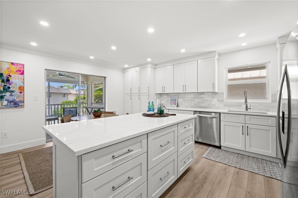 Live steps from the Gulf beaches and vibrant 5th Avenue South in this newly renovated villa at Royal Bay Villas, The concrete block residence offers serene southern sunny views, extra storage, 2 parking spots and walkability to the very best of Olde Naples. Inside, a thoughtful 2025 renovation transformed the home with COREtek flooring throughout, upgraded doors, casings, crown, and a fresh palette of warm whites and neutrals, including Sherwin Williams’ “Greek Villa.” The redesigned kitchen showcases new Pearl White cabinetry, quartz Bella Pietra counters by Pompeii, an island layout, pearlized Zellige-style backsplash, and recessed lighting. Bathrooms feature limestone shell showers, My Shower Doors enclosures, quartzite vanity tops (Cristallo in the primary, Taj Mahal in the guest), Uttermost mirrors, and Elfa adjustable closet systems from The Container Store. Additional upgrades include hurricane impact windows (2022), HVAC (2018), stainless appliances with a new dishwasher (2023), washer/dryer, Minka Aire and Fanimation fans, and a new water heater (2025). Outdoors, the lanai frame and screen were replaced in 2018, and the entire property has been refreshed with tropical landscaping. Royal Bay Villas offers pickleball, tennis, and a pool just steps from your door, with the Gulf beaches only 2 miles away. With added storage—a rare find downtown—and a community budget that already accounts for landscape renovations with no anticipated assessments, this home blends peace of mind with Olde Naples charm. Say yes to live, work, play, and invest in Downtown Naples, Florida. Ps bring your family & friends Unit 73 is available as well...