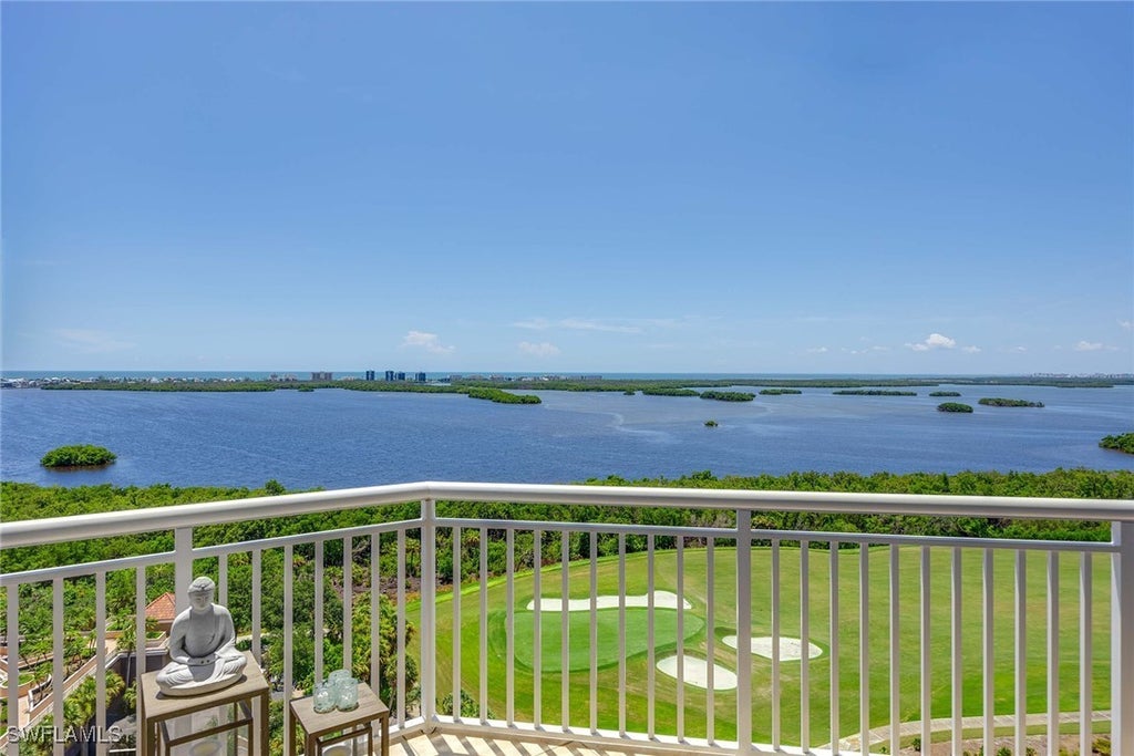 Prepare to fall in love at first sight with this extraordinary waterfront residence, where panoramic views of Estero Bay and the Gulf create an enchanting backdrop for your everyday life. This exquisite end unit, bathed in natural light, offers a move-in-ready experience with its sought-after coastal transitional design and high-end finishes throughout, all tastefully curated by a professional decorator. Enter the stunning living area, which seamlessly transitions to a covered balcony, ideal for enjoying waterfront views and sunsets. The space flows effortlessly into the elegant dining room and spacious, fully updated chef’s kitchen. It also features an impressive glass-enclosed bonus space with floor-to-ceiling windows, delivering breathtaking views of the water, golf course and community beyond. The luxurious primary suite is a sanctuary, boasting unparalleled views, a beautifully updated spa-like bath, a new custom walk-in closet and built-in storage wall. The generously sized guest room includes an updated en-suite bath and walk-in closet, while an additional bedroom, used as a den, offers versatility and convenience with a nearby updated full bath. This condominium is complete with new electric shades throughout, a secure elevator with a private entrance foyer and two garage parking spaces on the second level. Amenities include secured entry, on-site manager, resort-style pool with spa, cabana bar and grills, state-of-the-art fitness center, clubhouse, card and billiards rooms, a theater and guest suites. Bonita Bay spans 2,400 acres and features a guarded and gated entrance, a private Gulf-front beach park with shuttles, and 12 miles of recreational and biking trails. Residents enjoy three recreational parks that include a butterfly garden, bocce, tennis, pickleball, basketball, playground, picnic areas, pet water stations, and kayak/canoe launch and storage. The community also boasts over 30 resident clubs, social events and a fabulous on-site marina with the charming Backwater Jack’s Restaurant, Sweet Water Boat Club and Gulf access. Proximity to The Promenade at Bonita Bay with great dining, shopping and fabulous farmers market. Bonita Bay Club membership is optional. The club offers exceptional services, amenities and facilities, including a stunning clubhouse, restaurants, dining options from casual to fine, full-service bars and five world-class golf courses. three on the main property and two in Naples. It features practice ranges, a short game practice area, a sports center with a saltwater pool, lap lanes and a sundeck, as well as 18 Har-Tru tennis courts, 10 pickleball courts and a new croquet court. The luxurious full-service spa and salon, along with the lifestyle center's nearly 20,000 square feet dedicated to fitness, were ranked #2 in Club + Resort Business for the 2023 Top-Ranked Fitness and Wellness Experience!