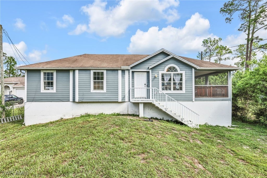 Step inside this elevated 3-bedroom, 2-bath home built in 2018 and feel the openness immediately. Vaulted ceilings and an open concept layout make everyday living and entertaining effortless, whether you’re keeping an eye on the kids or hosting friends. The kitchen features all stainless-steel appliances, and a washer and dryer are included, making your move-in seamless. From the living area, sliding doors lead to a screened, covered lanai balcony, the perfect spot to enjoy morning coffee or unwind in the evenings while taking in the peaceful surroundings. Beyond the lanai, the backyard stretches across 1.14 acres, blending landscaped areas with natural wooded spaces. There’s plenty of room to add a pool, fire pit, or create a custom outdoor retreat. Beneath the home, the elevated design provides generous storage, while privacy hedges along the front and east side enhance the secluded feel. Set in Golden Gate Estates, this home combines quiet privacy with convenient access to daily essentials. Palmetto Elementary is just 4 miles away, Cypress Palm Middle is 6 miles, and Publix is only 7 miles. With well and septic utilities, manual shutters, and no HOA, you have both comfort and freedom to make this home uniquely yours. Come see this gem for yourself. Schedule your showing today!