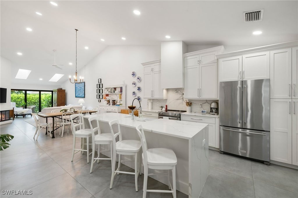This elegantly remodeled villa is ideally located in the highly sought-after and rarely available Villas of Park Shore, a stone’s throw from the beach. Thoughtfully renovated from top to bottom, this residence offers modern luxury with every detail carefully curated. The eye-catching kitchen features custom cabinets, high-end stainless steel appliances, a seamless continuation of the countertop to the backsplash, a large island, chic hardware, and a convenient pot filler. The open-concept floor plan flows effortlessly into the bright, airy living area, where a cozy fireplace and abundant natural light from skylights and vaulted ceilings create a warm ambiance. The remodeled primary ensuite wet bath is a spa-inspired escape with a freestanding soaking tub, a separate shower, and premium finishes for ultimate relaxation. The beautifully remodeled laundry room adds both style and functionality. The gated custom courtyard and pavered lanai, surrounded by privacy hedges, offer serene retreats for outdoor living in both the front and back of the home. In addition to the stunning design, essential upgrades include hurricane impact windows, a tankless water heater, an A/C replacement (2019), and updated plumbing and electrical systems in 2019. The new flooring throughout, remodeled guest bath, and freshly painted exterior in 2024 complete this exceptional property. Enjoy community amenities, including a clubhouse, pool, and gym, and embrace the ideal Park Shore location, just minutes from sun-soaked Gulf beaches and the vibrant dining and entertainment options at Venetian Village. You can join the Park Shore Association for an additional fee, granting exclusive beach access, parking, a scenic walking trail, and a BBQ area. Don’t miss this rare opportunity to own a residence that combines timeless elegance, prime location, and modern comfort in the heart of Park Shore, with every amenity at your fingertips.