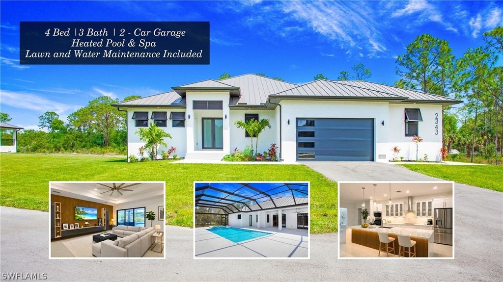 2025 new construction residence in Golden Gate Estates offering 5 bedrooms plus den, 5 bathrooms, and approximately 3,590 square feet of living space on 2.09 acres. The main residence features 4 bedrooms, 3 bathrooms, a 2-car garage, and an open-concept layout with modern finishes throughout. A separate suite includes its own kitchen, bedroom, and bathroom, providing flexibility for multi-generational living or private guest accommodations. The outdoor living area is designed for year-round enjoyment with a heated concrete pool, spa, and screened lanai overlooking a peaceful water feature and wooded surroundings. Constructed with concrete block, impact-resistant windows and doors, and a metal roof for durability and efficiency. No HOA restrictions. Space available for boats, RVs, and horses. Owner covers lawn care, lawn service, and water system maintenance. Conveniently located near shopping, dining, and Big Corkscrew Regional Park with easy access to major roadways. Long-term rental available at $6,000 per month. Available starting May 15. Long-term rental only with a minimum 1-year lease.